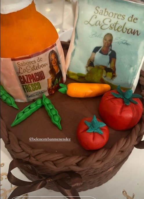 Los invitados regalaron a la cumpleañera una original tarta con una versión dulce de su popular gazpacho y sus patatas fritas.