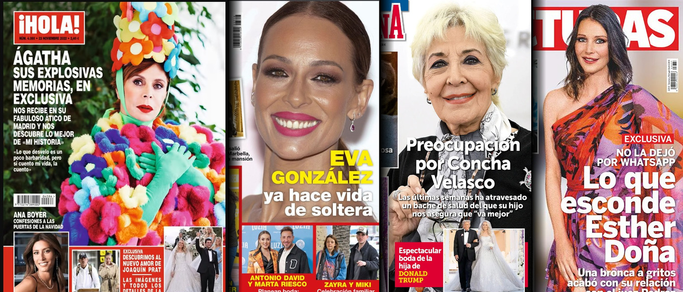 Hola adelanta su contenido en un reportaje realizado en el colorido piso de la diseñadora en la Castellana madrileña, y le dedica su portada, en la que Ágatha aparece vestida casi de árbol de Navidad, pero decorado con flores.