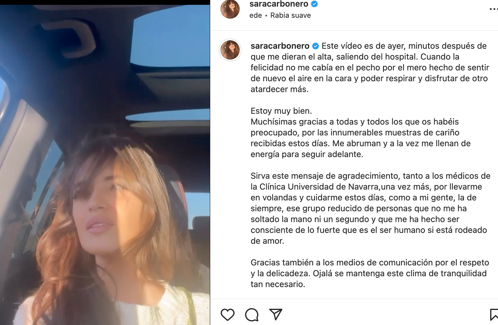 El vídeo cuenta su salida del centro y en él la periodista agradece a todos el interés. "Este vídeo es de ayer, minutos después de que me dieran el alta, saliendo del hospital.", explica, llevando la contraria un tanto a su ex, Iker Casillas, que denunció el sensacionalismo de la noticia de su ingreso:"Ojalá se mantenga este clima de tranquilidad tan necesario", ha expresado.