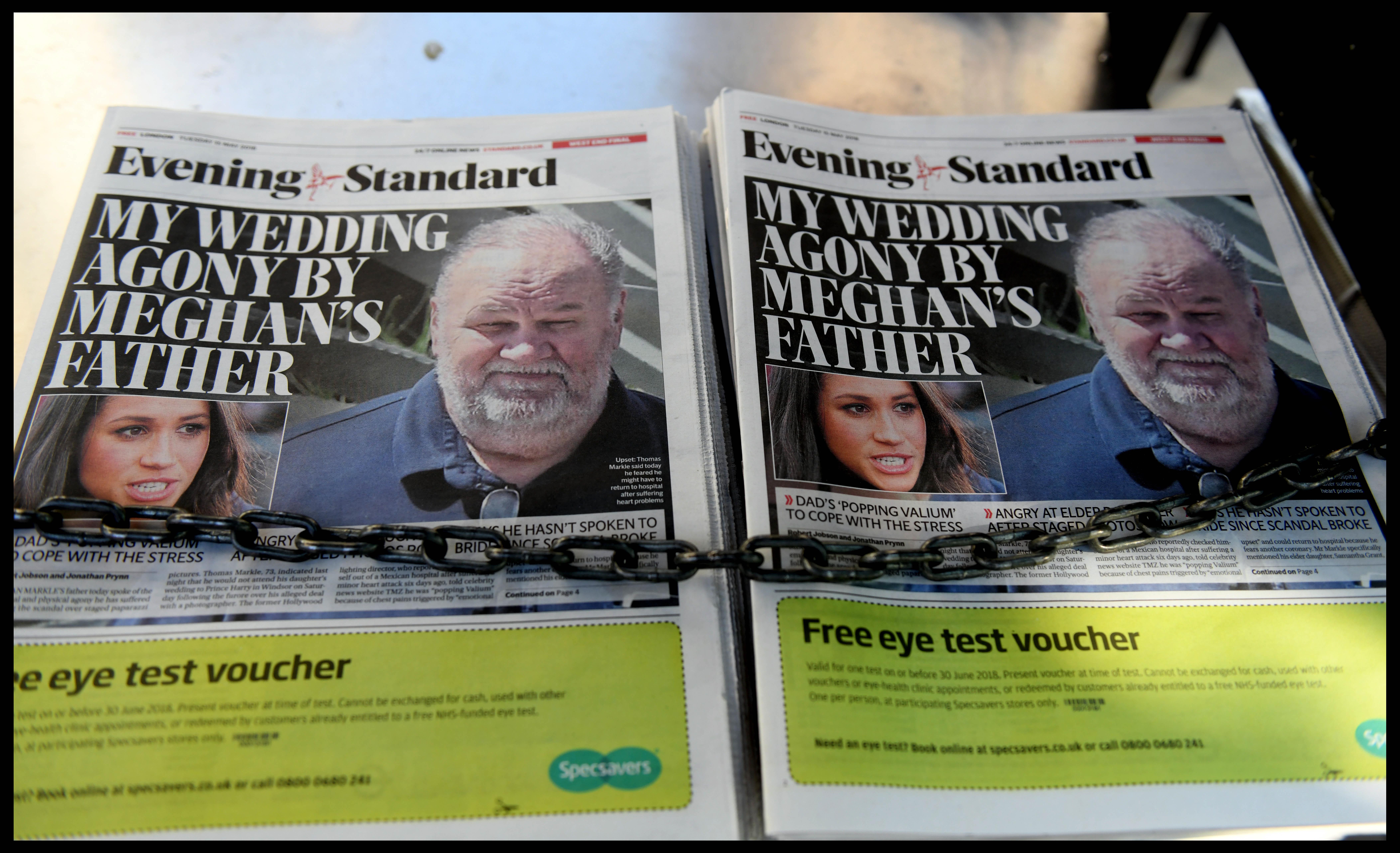 Unos días antes de la boda de la pareja, Meghan descubrió que su padre vendía a la prensa imágenes manipuladas, situación que ella descubrió antes de que saliese a la luz en los medios de comunicación e hizo todo lo posible para evitar que eso pudiera dañar su imagen. Se puso en contacto con Thomas Markle para preguntarle si eran ciertos los rumores y no recibió respuesta hasta que finalmente perdieron el contacto. Más tarde, se enteró por la prensa de que su padre no asistiría a la boda que tuvo lugar en la capilla San Jorge del Castillo de Windsor.