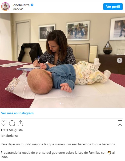 "Para dejar un mundo mejor a las que vienen. Por eso hacemos lo que hacemos. Preparando la rueda de prensa del gobierno sobre la Ley de Familias con pollitos al lado", ha escrito Belarra, con el pequeño tumbado sobre la mesa en la que su madre trabaja.