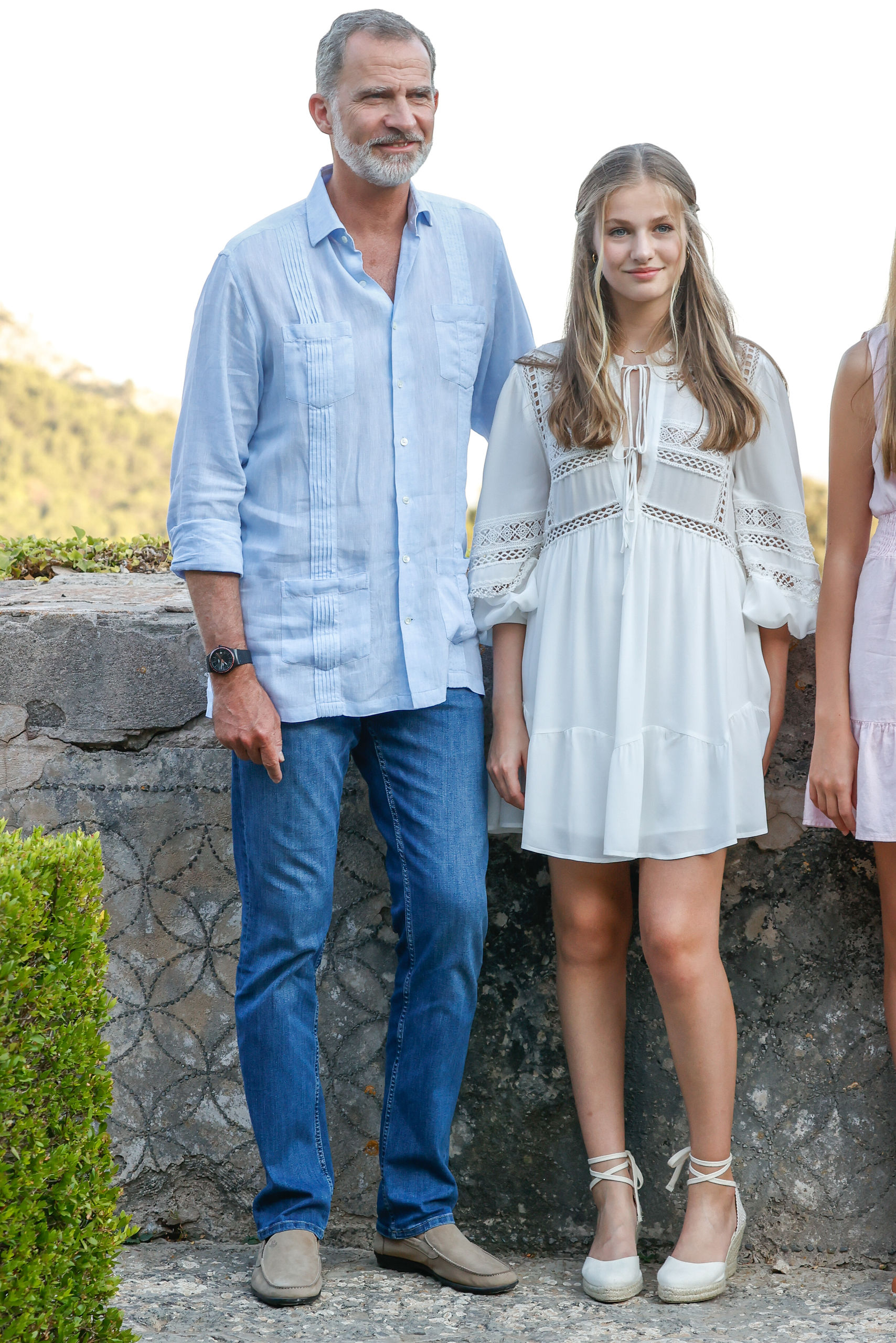 Para esta importante ocasión, Leonor hizo honor a su título con un look con aires de princesa y estilo bailarina. La hija de Felipe VI lució un bonito vestido azul cielo de lo más favorecedor de la marca española de novias e invitadas Miphai, rompiendo con su habitual estilo.