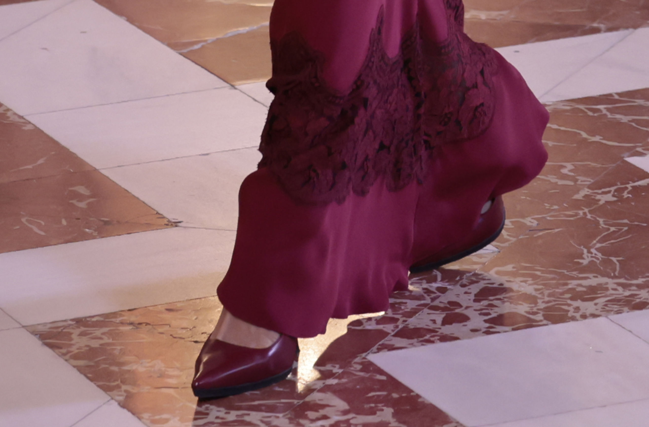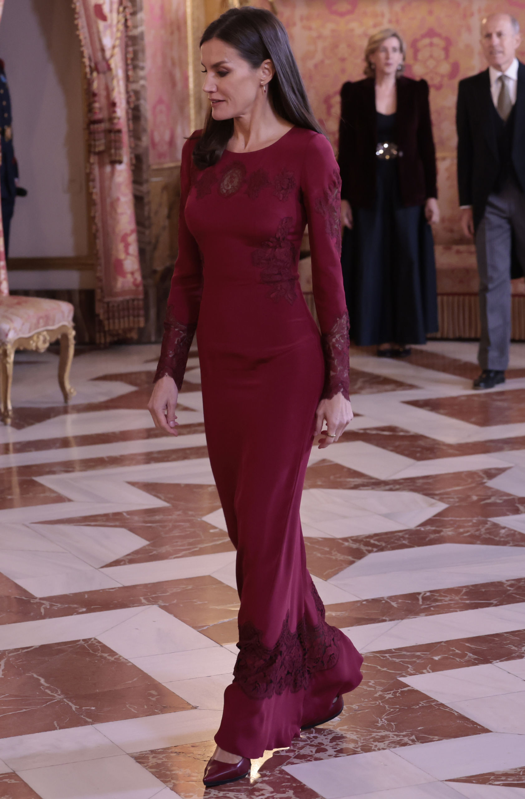 Ya en el interior del Palacio Real, Letizia ha lucido el Felipe Varela en todo su esplendor, dejando al descubierto todos sus detalles. Para acompañar a este diseño, la monarca se ha decantado por unos salones de la marca Magrit.