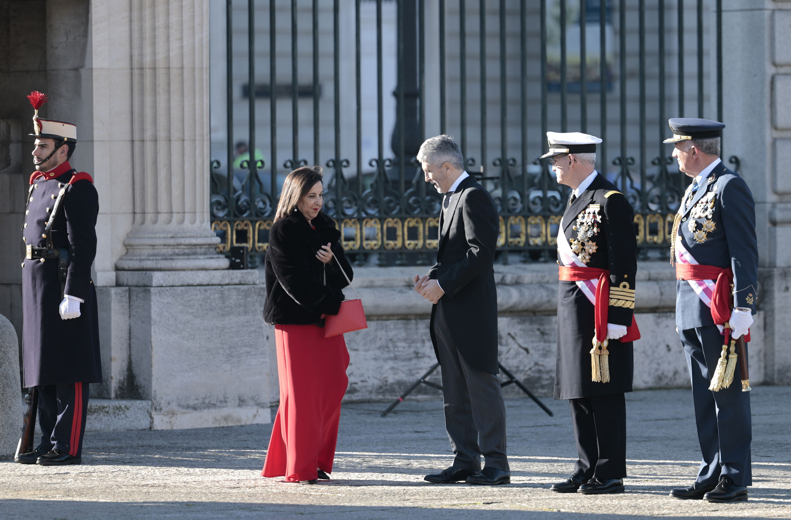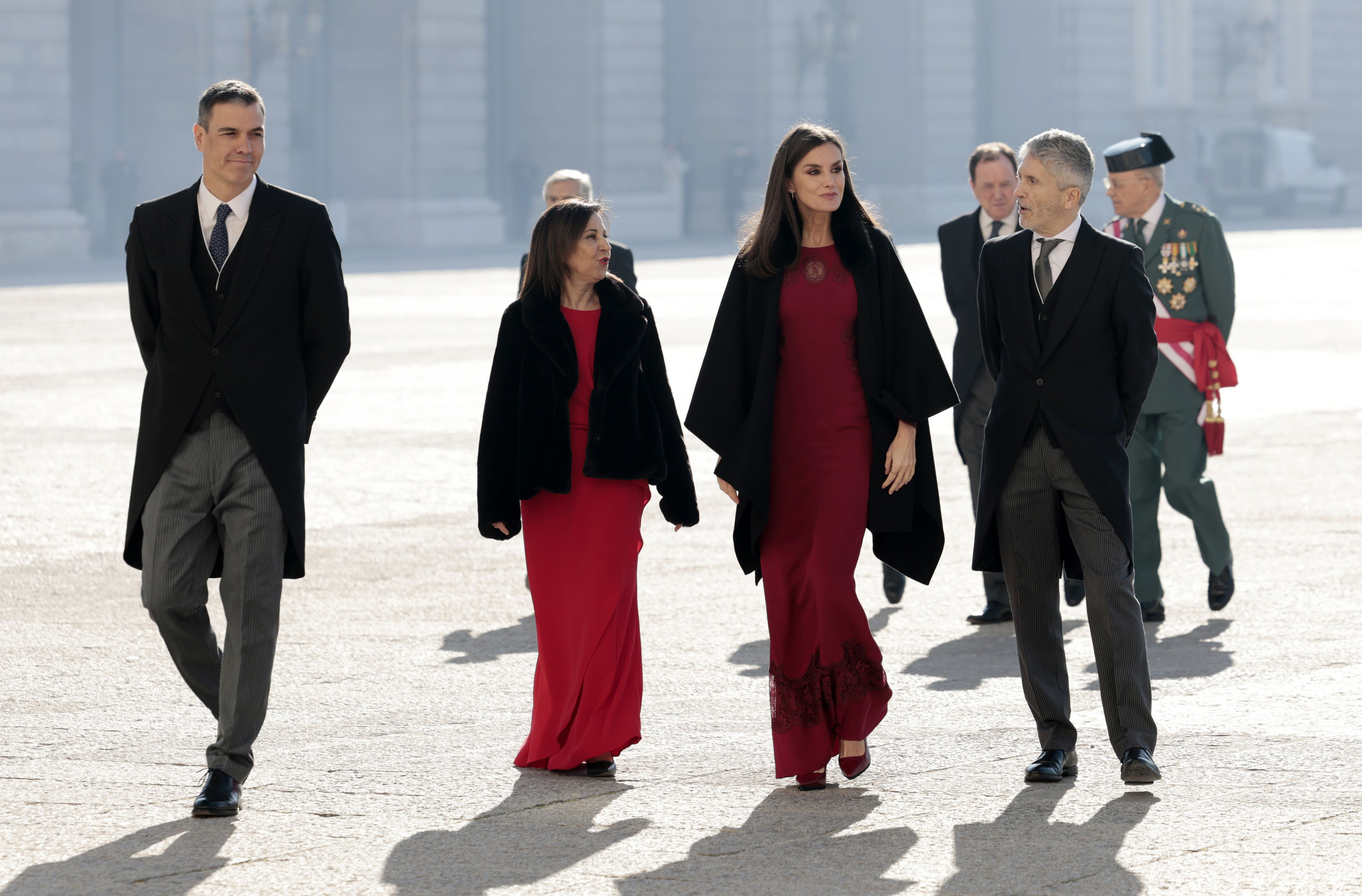 Felipe VI, con uniforme de capitán general del Ejército del Aire, y doña Letizia han llegado en el coche oficial a la Plaza de la Armería, donde Sánchez aguardaba para saludarles junto a Robles y el ministro del Interior, Fernando Grande-Marlaska.