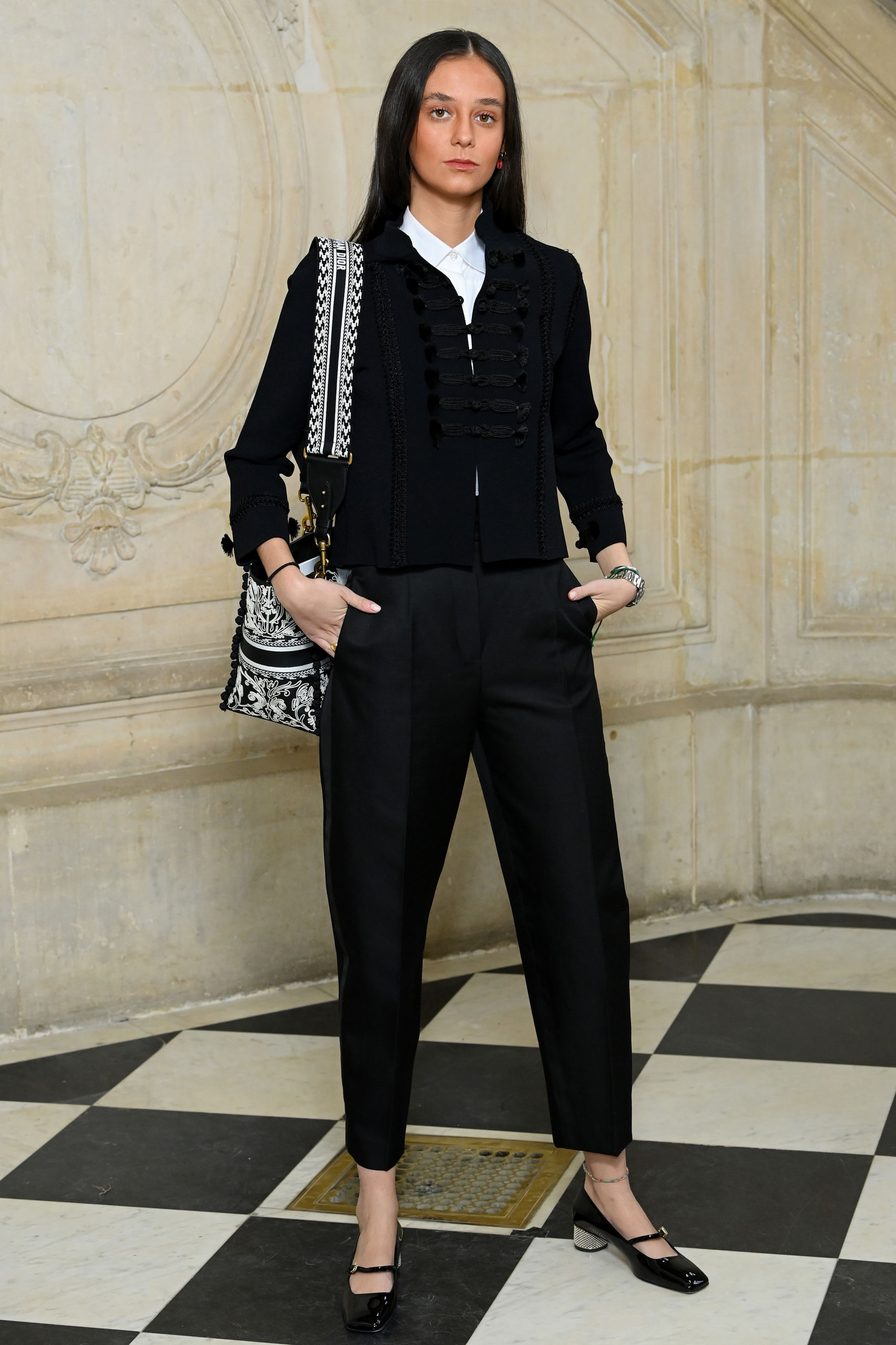 En cuanto al estilismo para el desfile, Victoria lució una chaqueta negra entallada y corta con cierres tipo alamar, una oda a la inspiración ecuestre de la colección y muy apropiada para ella como buena aficionada a los caballos. Combinó la chaqueta con pantalón del mismo color confeccionado en lana y seda negras, con corte recto y cintura alta con pinzas, además de bailarinas de charol con hebillas y tacón cilíndrico brillante.