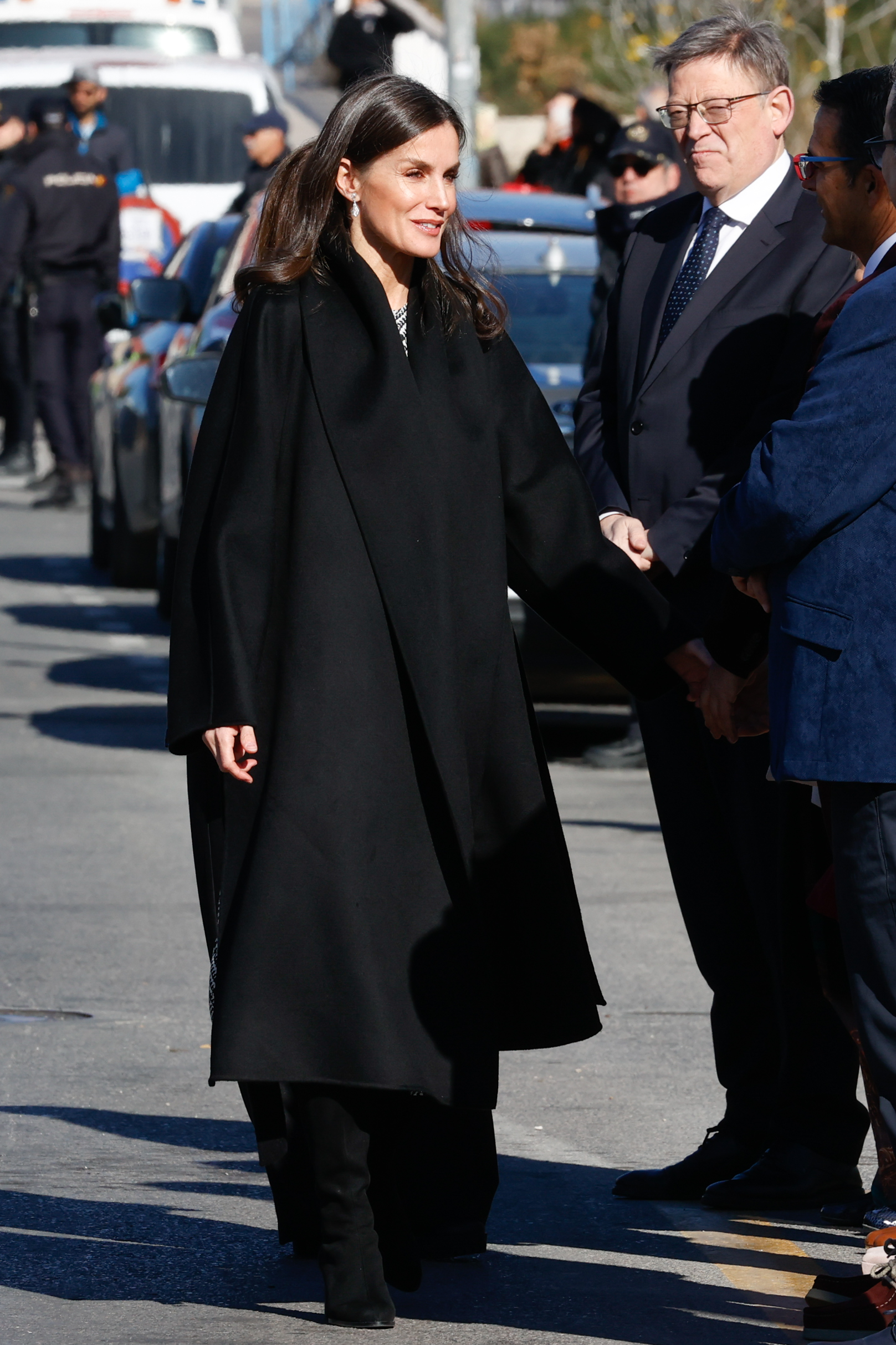 En esta ocasión lució un vestido estampado de Pedro del Hierro y abrigo negro de Carolina Herrera, combinados con botas negras altas.