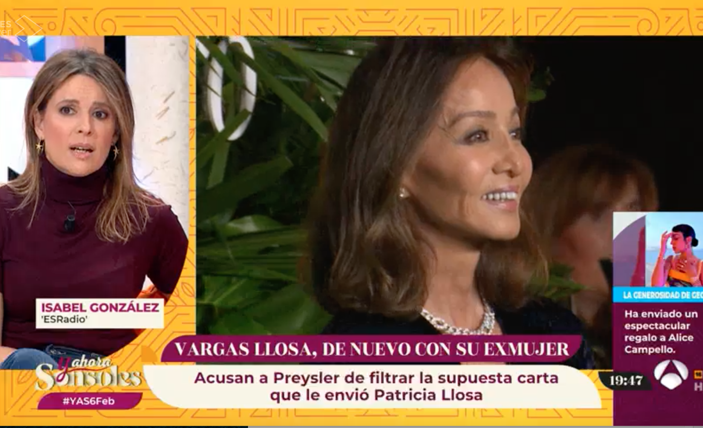 González advirtió también que la filtración de Preysler de la carta enviada por Patricia a quien hace daño no es al escritor, sino "a Patricia Llosa". Isabel, por su parte, está ojo avizor a lo que se publica sobre ella y está pendiente del tema en diversos medios: "Ha fichado abogados muy potentes y nos está escuchando con audífono por si hay demandas que emprender." Por otro lado, y para demostrar que su agenda sigue sin Isabel Preysler, este mismo lunes el Nobel acudió a una clínica acompañado de su hija Morgana para "quitarse unos puntos en el pie".