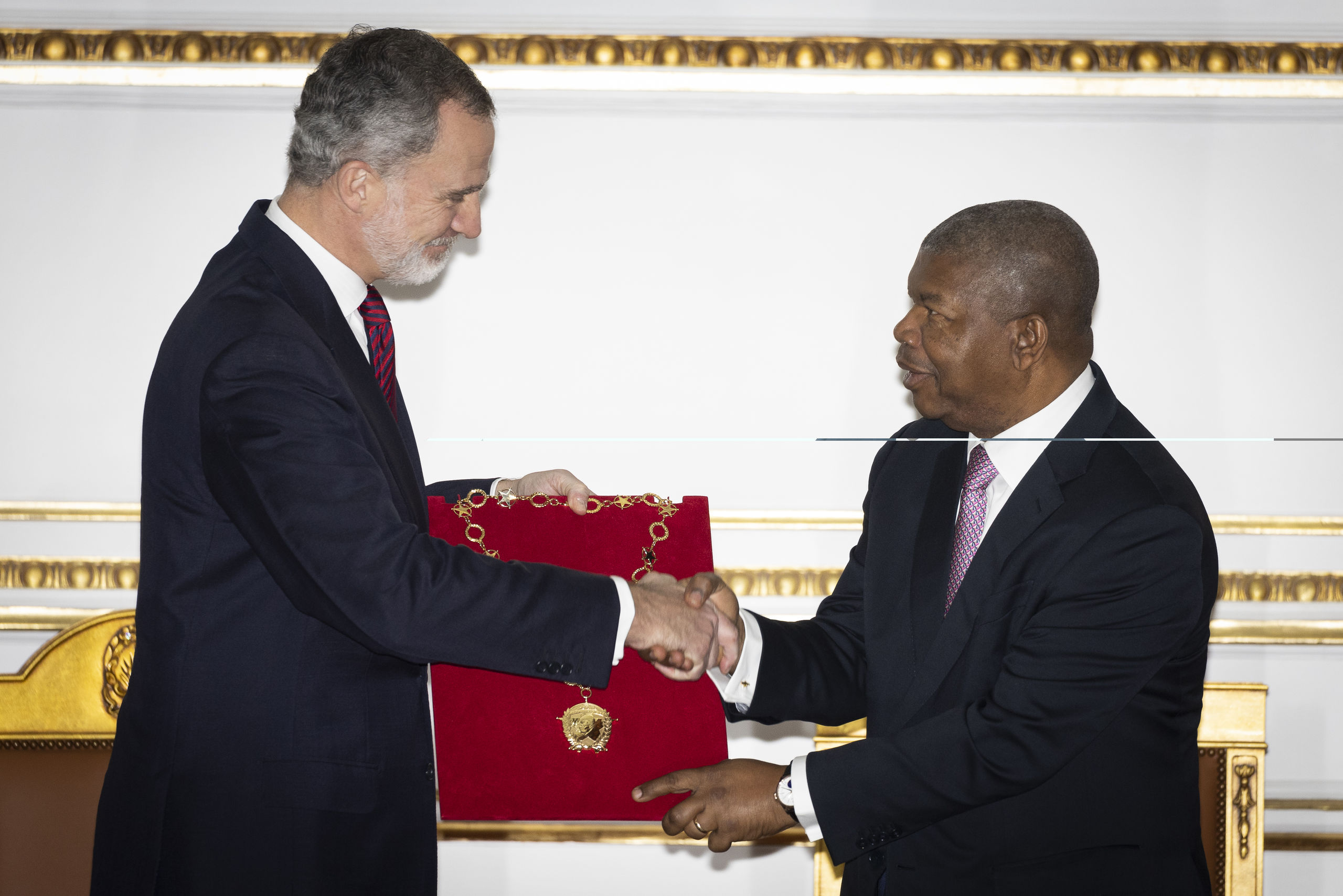 En la Sala Noble tuvo lugar la ceremonia de intercambio de condecoraciones. “España, por su geografía e historia, se proyecta en múltiples dimensiones exteriores. Aparte de nuestra identidad europea y de nuestra profunda convicción en el exitoso proyecto que es hoy la Unión Europea, es bien conocida nuestra proyección iberoamericana y atlántica por evidentes razones históricas, culturales y lingüísticas… pero, también son clave para España, nuestra proyección y vocación africanas, tanto en la ribera del Mediterráneo, como hacia el sur de este extenso continente", destacó el Rey.