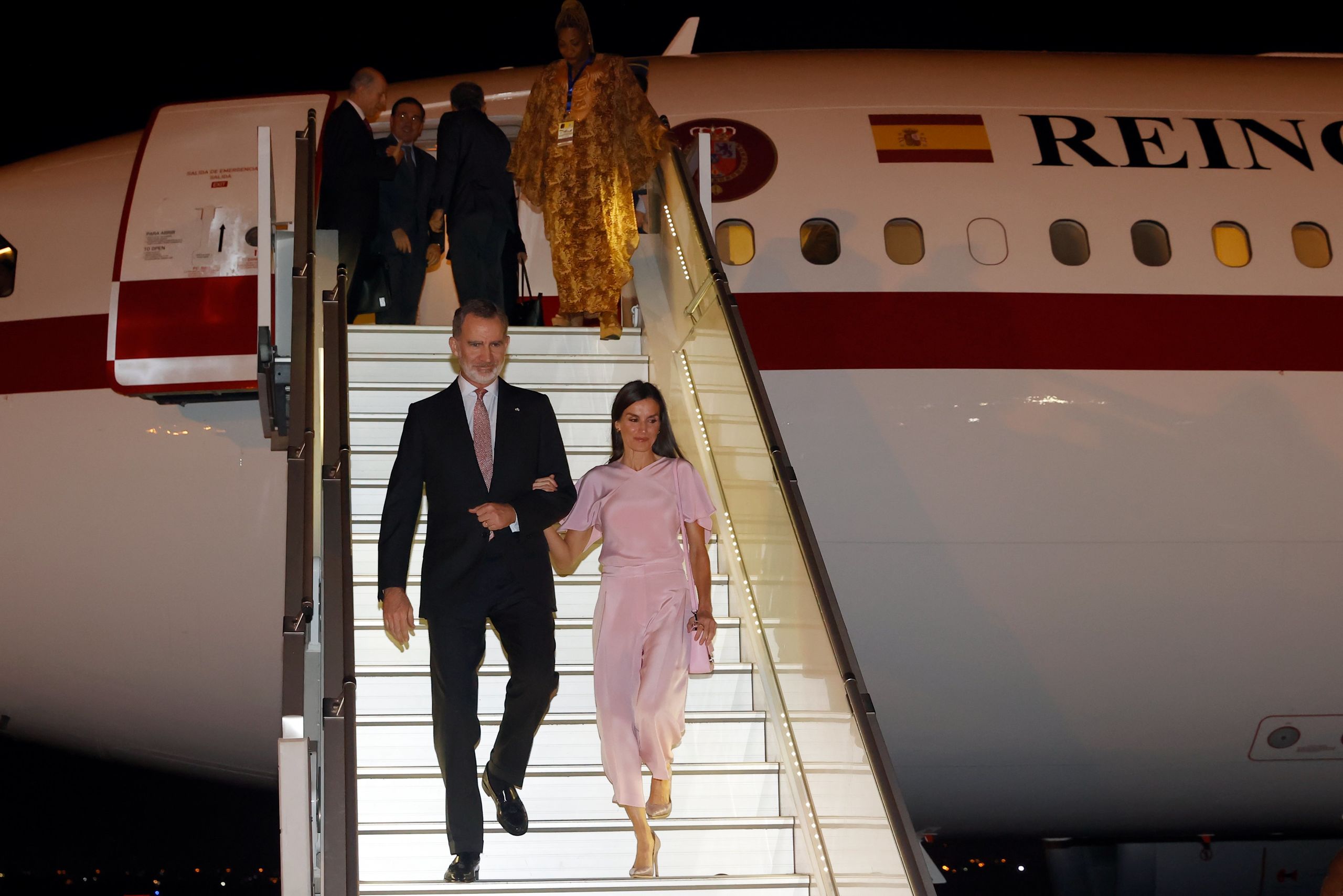 El avión de la Fuerza Aérea Española aterrizó en el aeropuerto internacional Quatro de Fevereiro a las 20.10 hora local (misma española), donde los reyes fueron recibidos por el ministro de Exteriores angoleño, Téte António, al pie de la escalerilla.