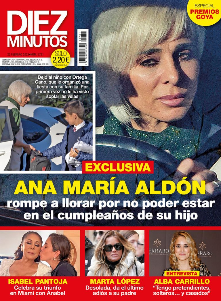 La revista Diez Minutos lleva en su portada de este miércoles a Ana María Aldón llorando en plena calle. Las imágenes fueron tomadas el día 9 de febrero, día en el que su hijo cumplía diez años. La gaditana recogió al menor del colegio y comieron juntos pero después lo dejó en casa de su padre José Ortega Cano para que disfrutara junto a él y resto de su familia de una espectacular fiesta de cumpleaños.