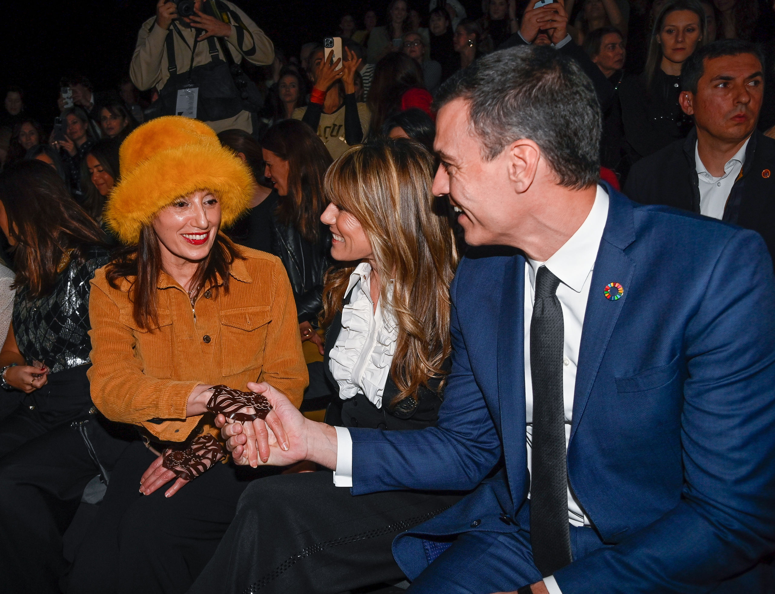 Con las modelos ya preparadas en línea recta para salir a la pasarela, el desfile se retrasó mientras el resto de celebridades se sentaban en la primera fila, entre ellas, la actriz Macarena Gómez, Eugenia Martínez de Irujo o su hija Tana Rivera. Tras una larga espera, Pedro Sánchez y Begoña Gómez salieron por fin del backstage y entraron directamente por detrás al desfile, siendo los últimos en llegar y demorándolo por lo menos media hora, a pesar de que oficialmente empezaba a las 19 horas.