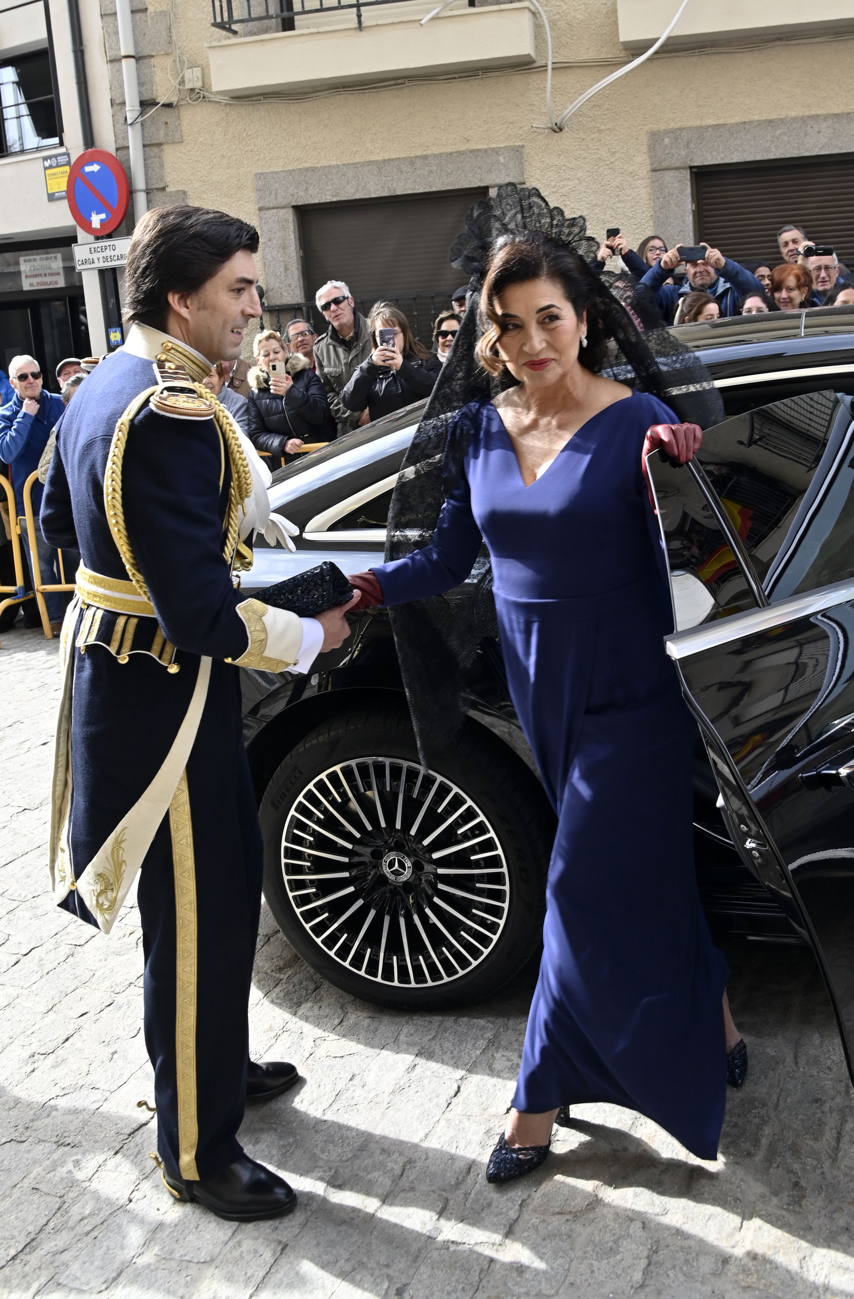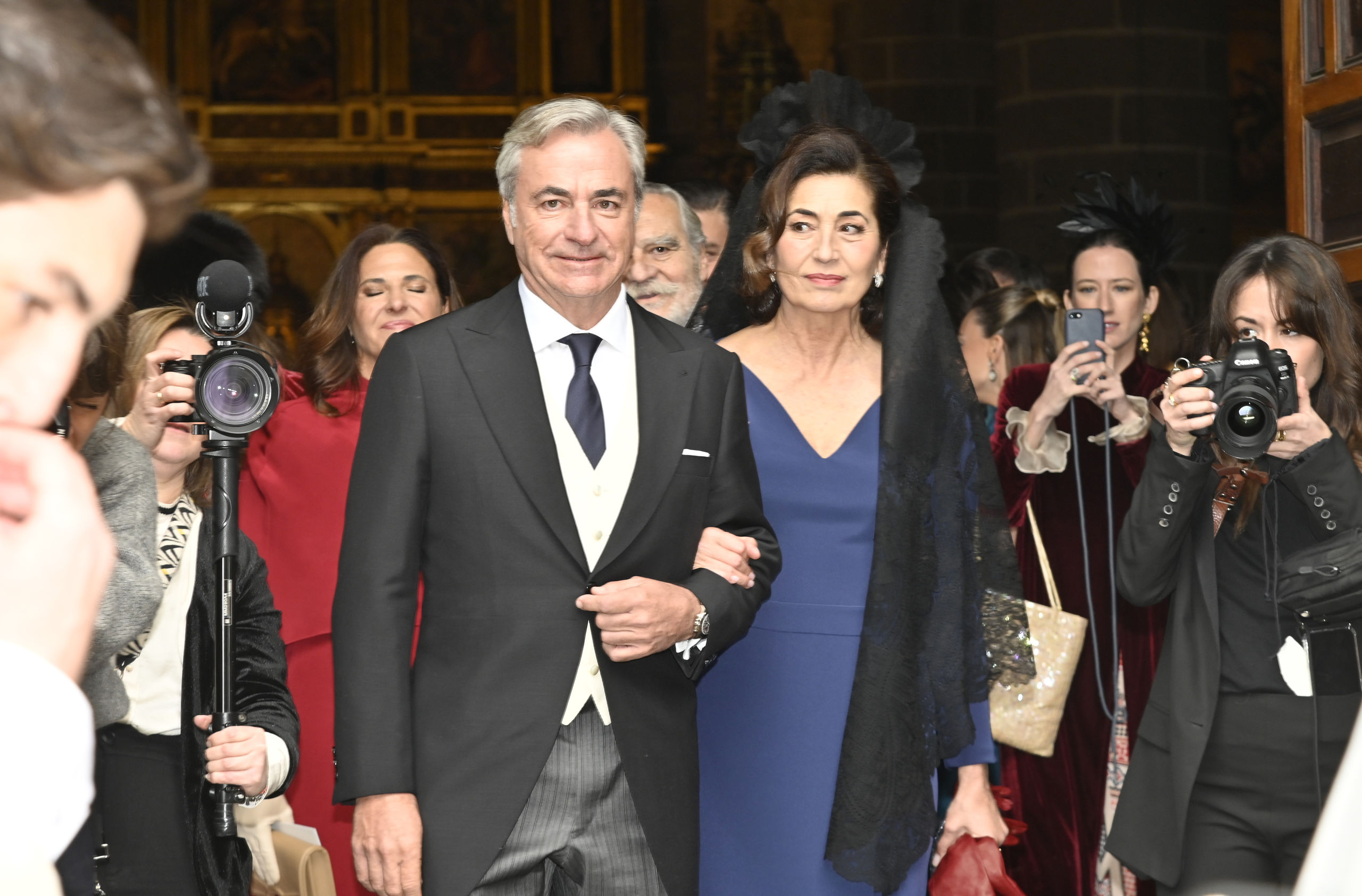 Para un día tan especial la madrina ha lucido un elegante vestido azul marino de corte recto hasta los pies y una mantilla bordada de color negro. Por su parte el padre de la novia ha escogido un clásico chaqué que le quedaba como un guante.