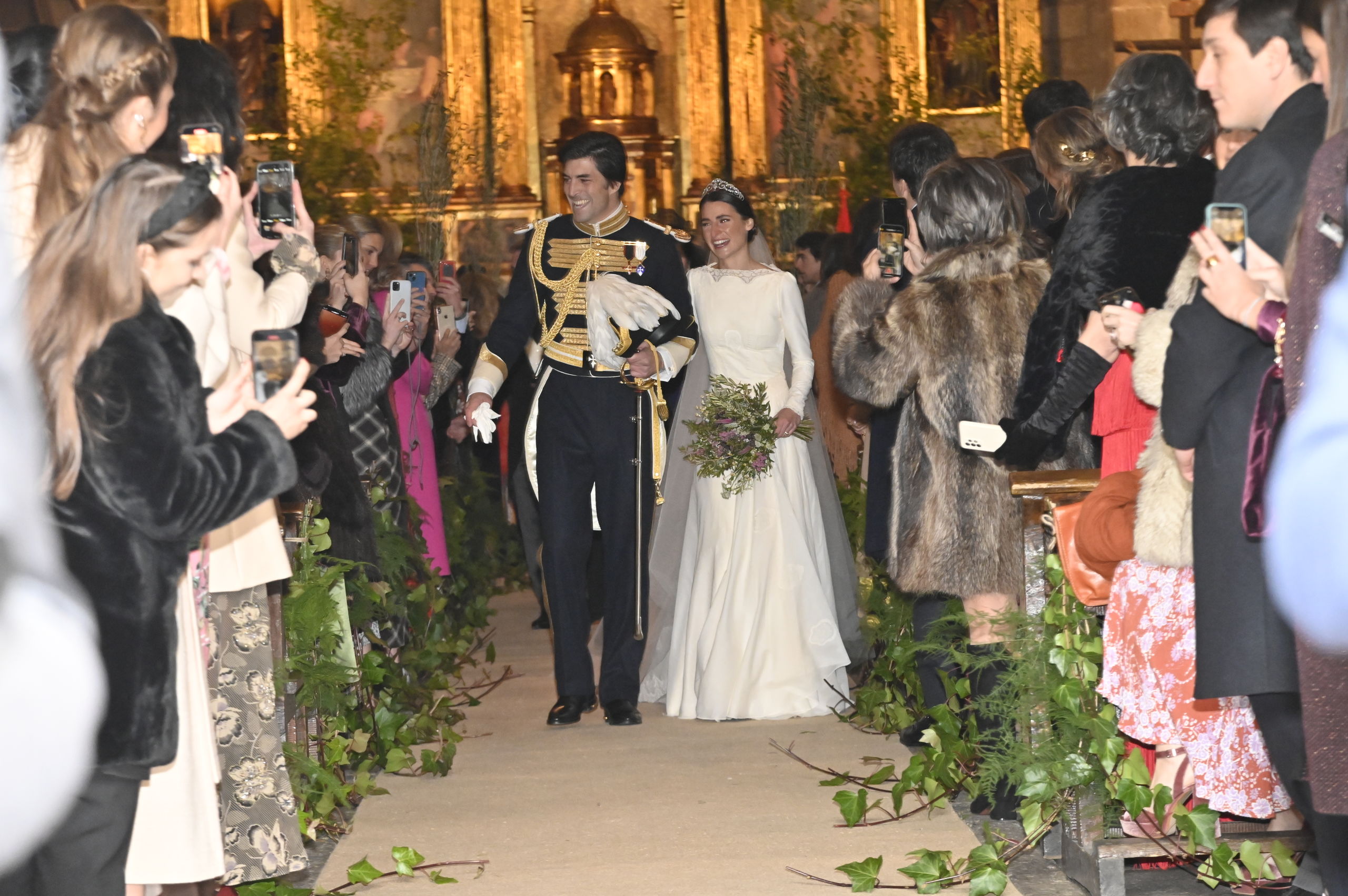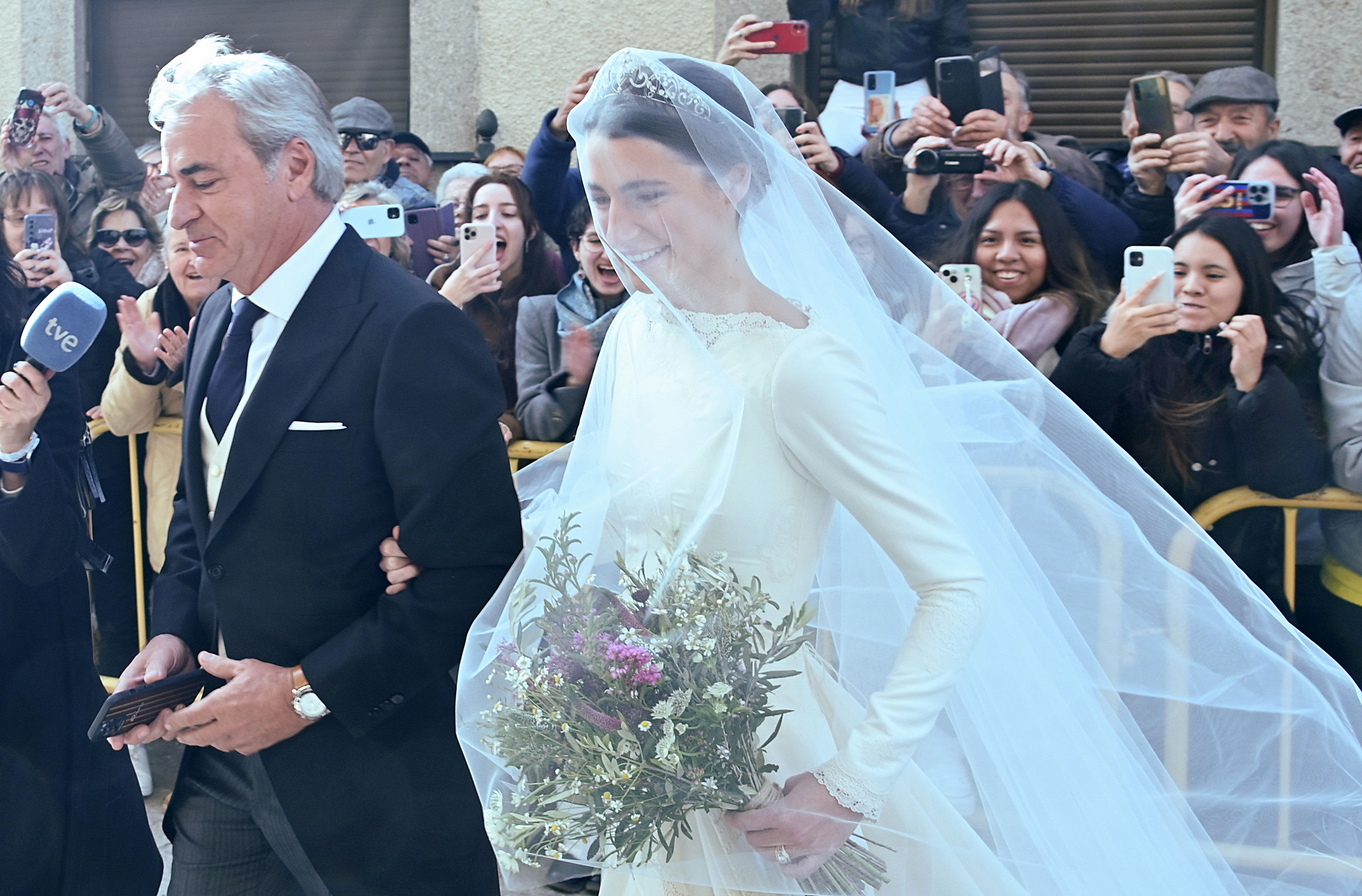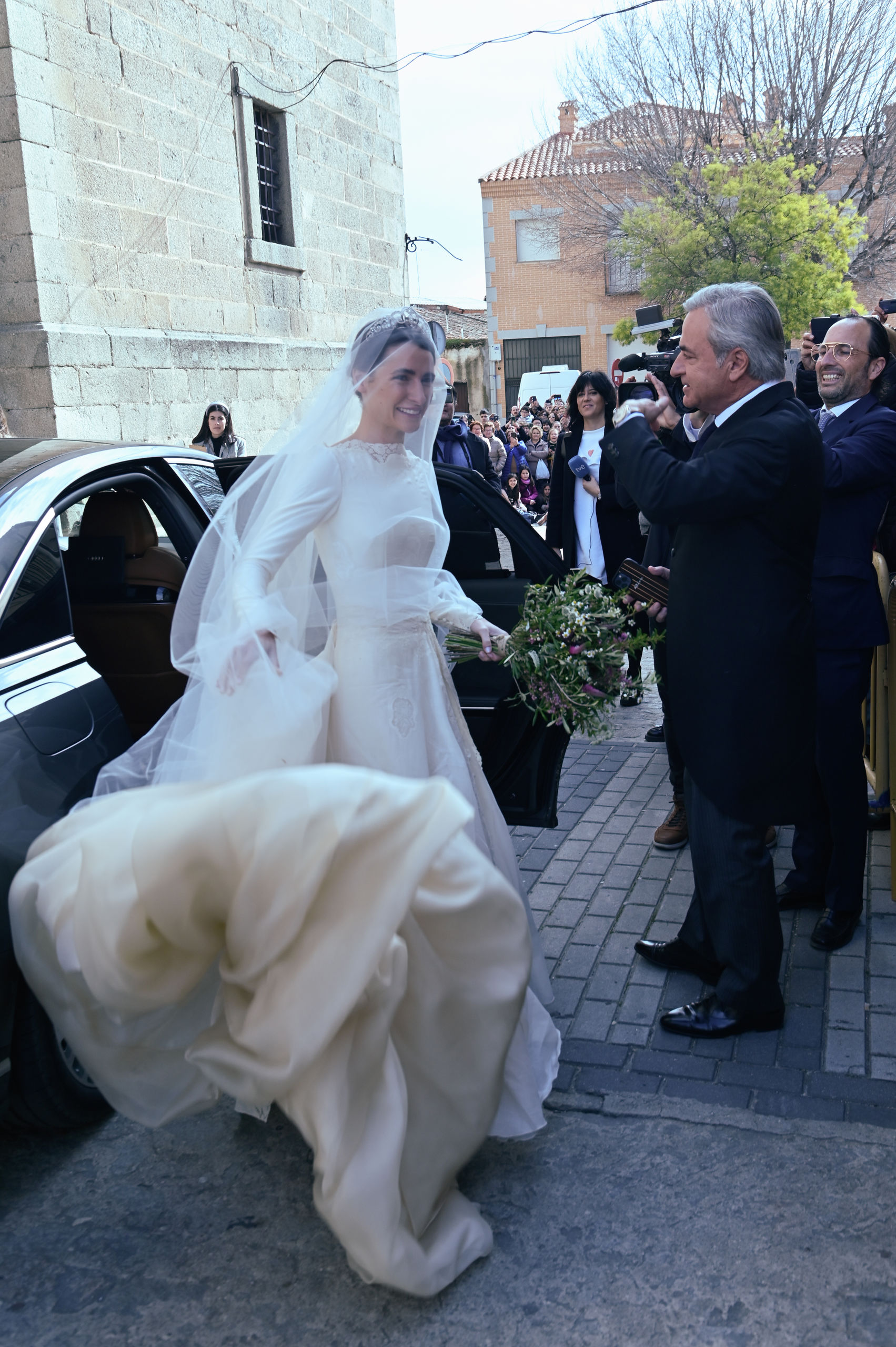 La novia y el padrino entrando en el templo donde les esperaban los invitados. Fuera del templo se agolpaban cientos de curiosos y habitantes del pueblo que no querían perderse el evento.