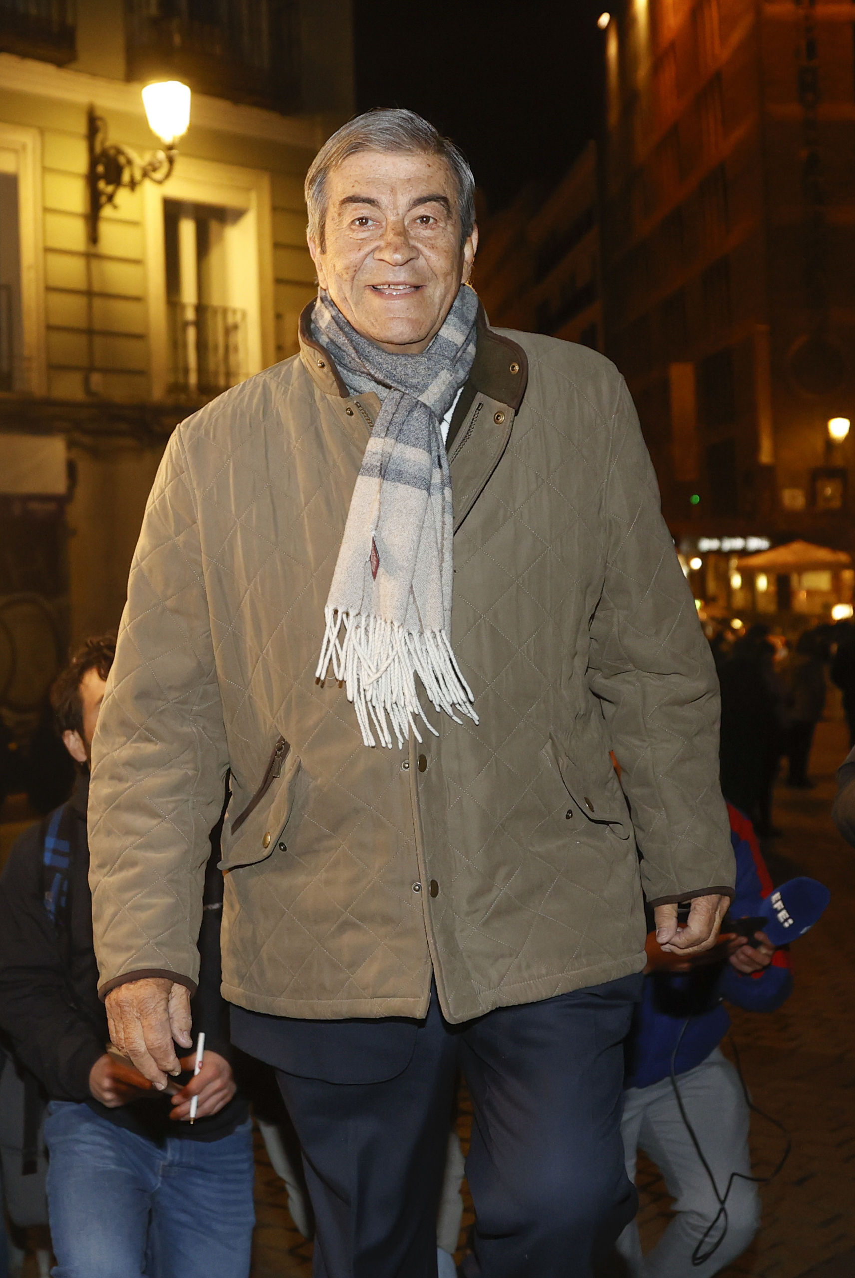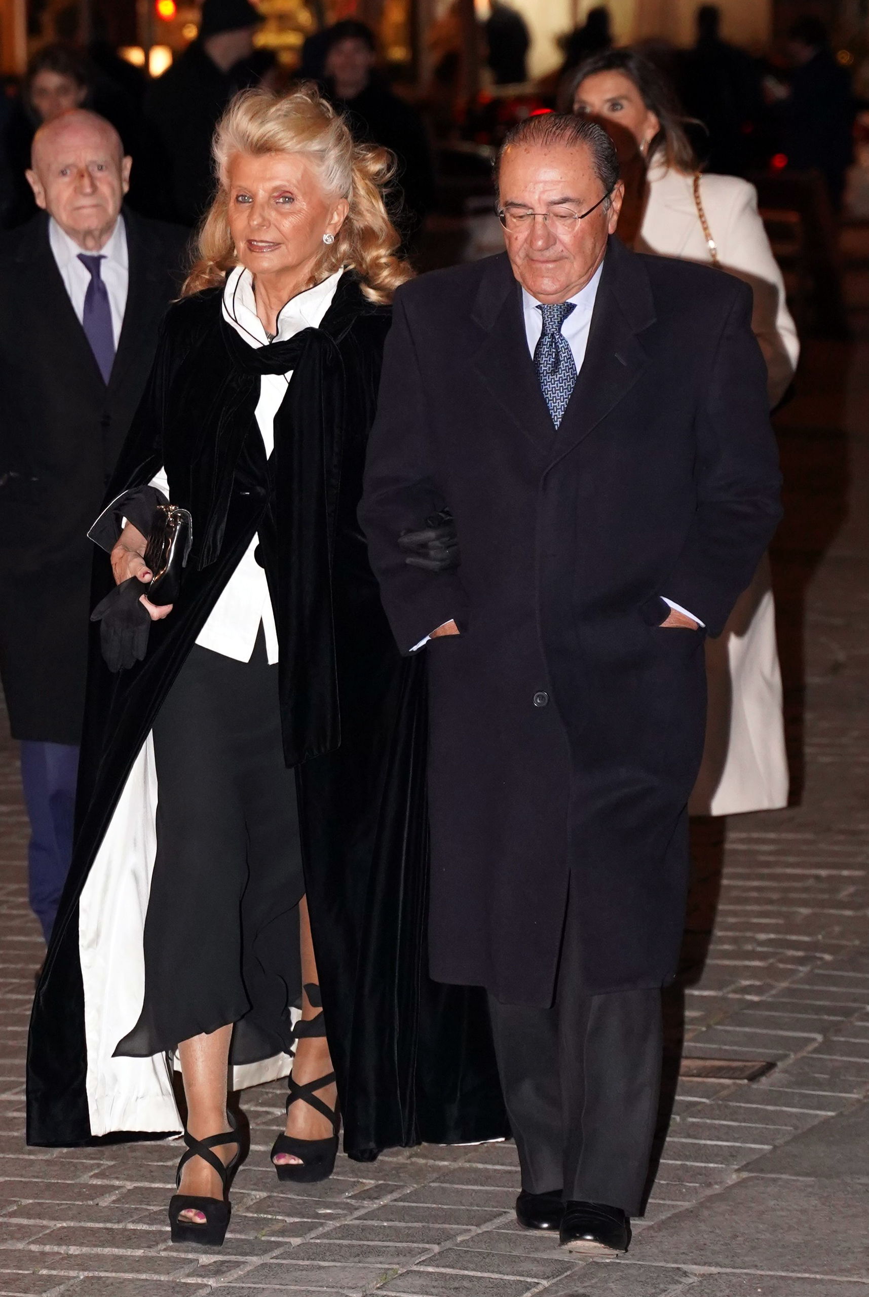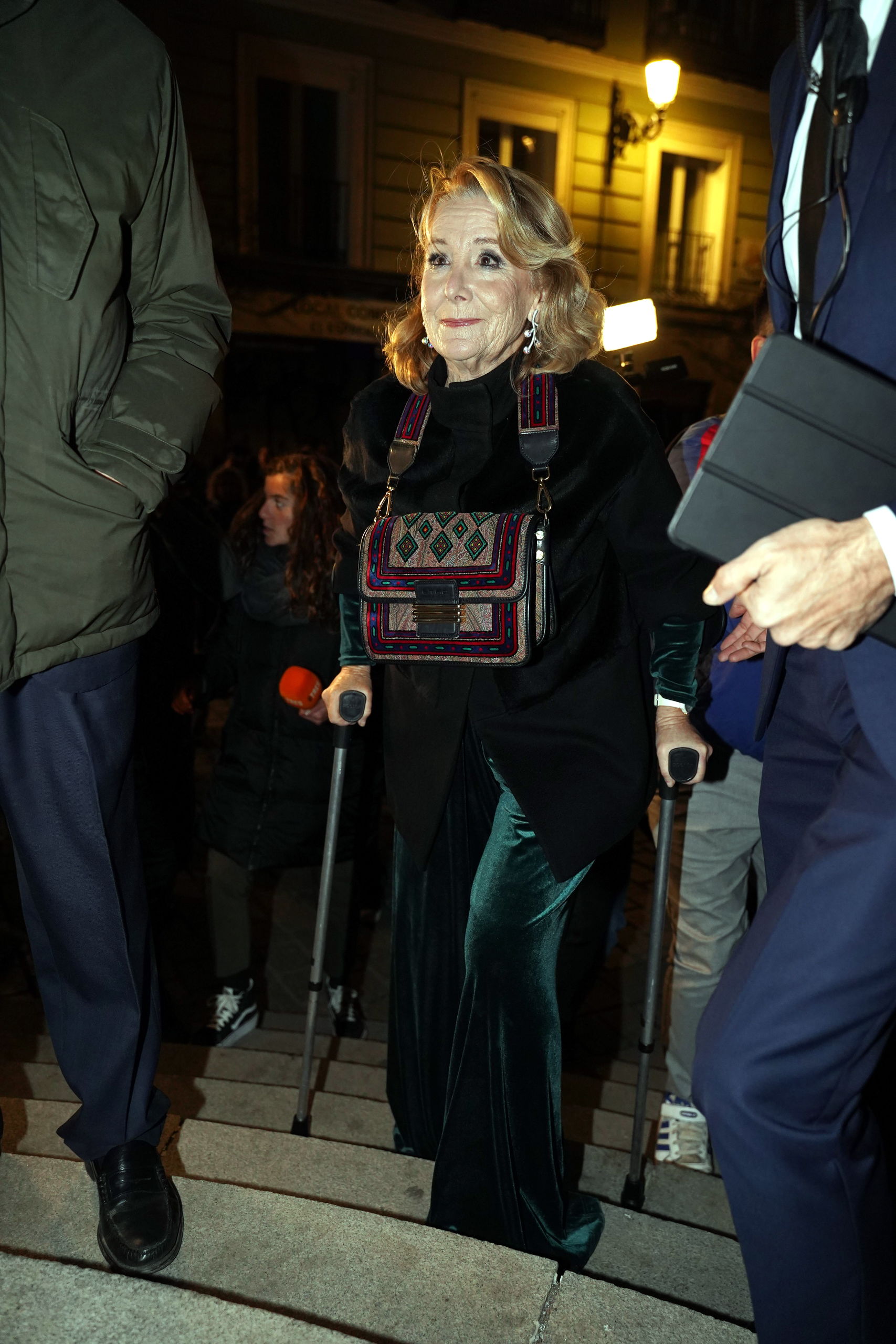 La expresidenta de la Comunidad de Madrid tuvo que colgarse el bolso al cuello porque caminaba con muletas por culpa de una caída que sufrió hace unos días. Acudió acompañada de su marido Fernando Ramírez de Haro.