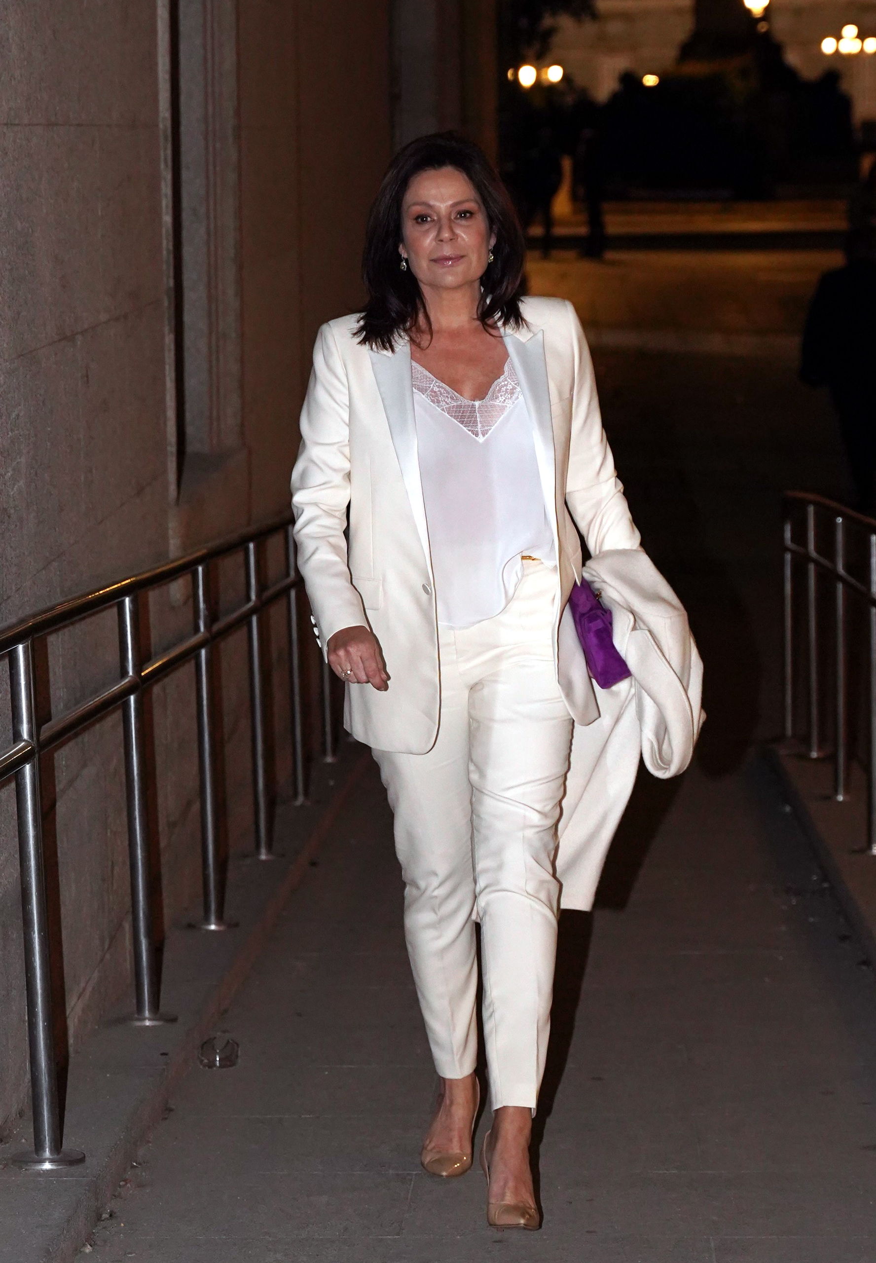 La esposa del empresario Fernando Fernández Tapias, con un elegante conjunto de chaqueta y pantalón color blanco.