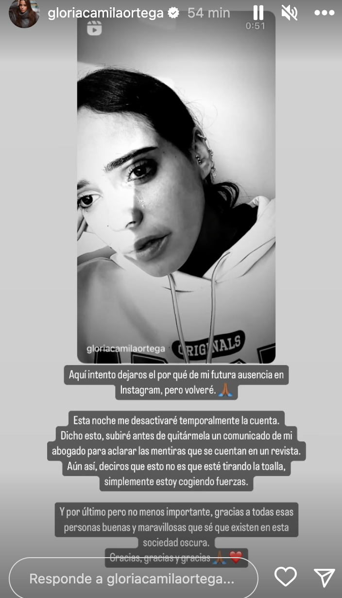 Lo que Gloria Camila no ha borrado es un "stories" en la red social en el que anuncia su inminente retirada de las redes sociales y da las gracias a aquellos que sí la han apoyado.