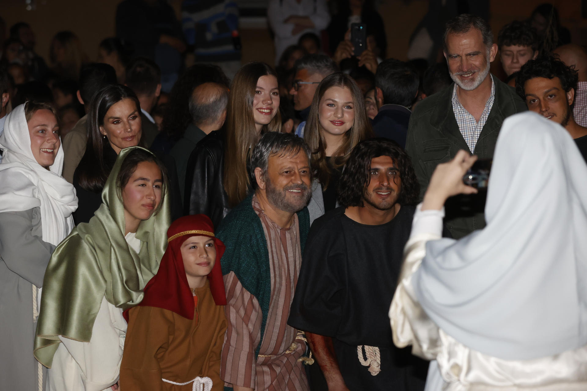 Los Reyes, la princesa Leonor y la infanta Sofía no han dudado en posar para selfis también con los actores de la representación de la pasión, muchos de ellos sorprendidos por su presencia, que no había sido anunciada oficialmente con anterioridad.