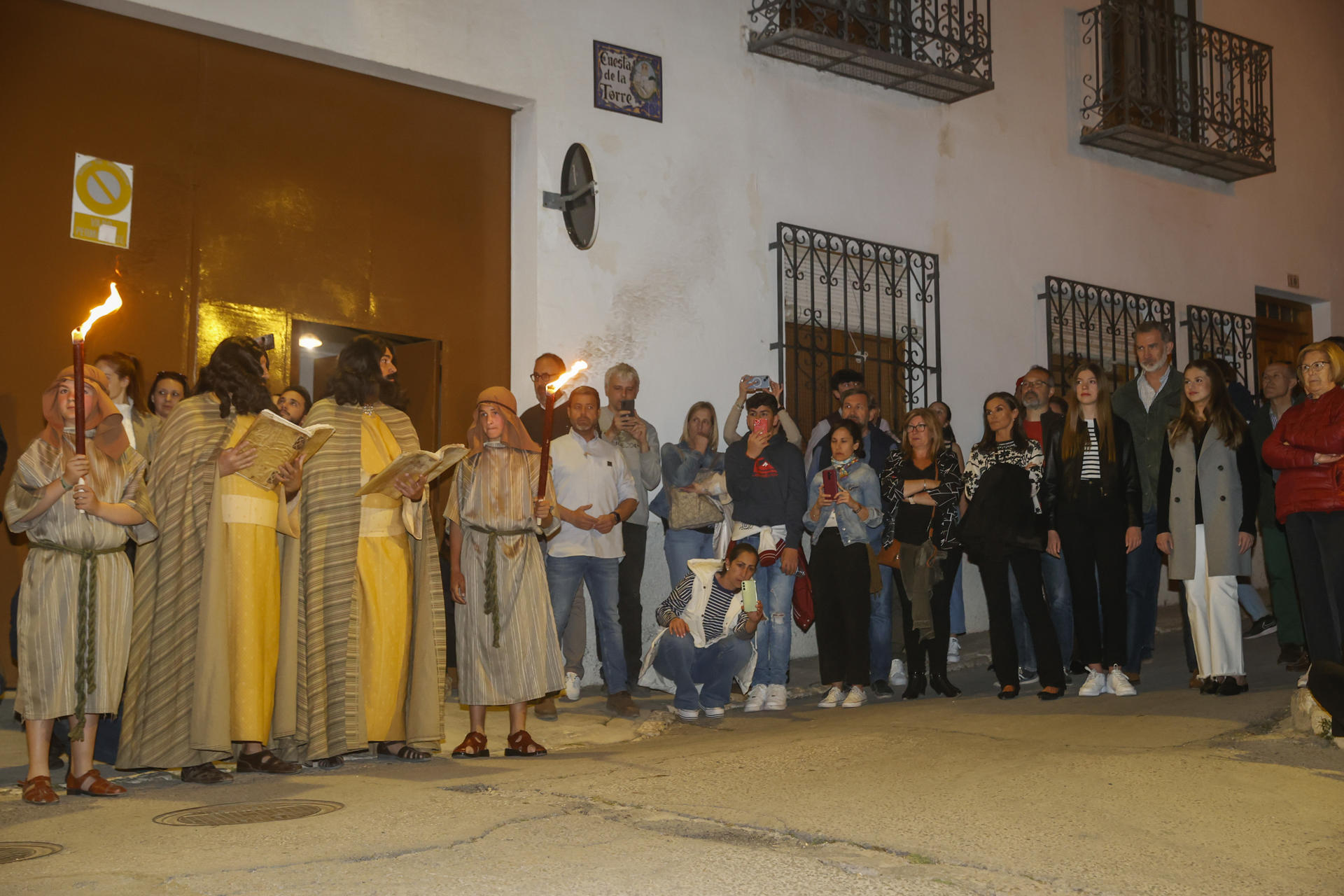 El Rey, Felipe VI, y su familia han seguido su itinerario más tarde para contemplar desde un recodo de la cuesta de la Torre su segunda escena, una de las caídas de Jesús con la cruz, representada a pocos metros de ellos.