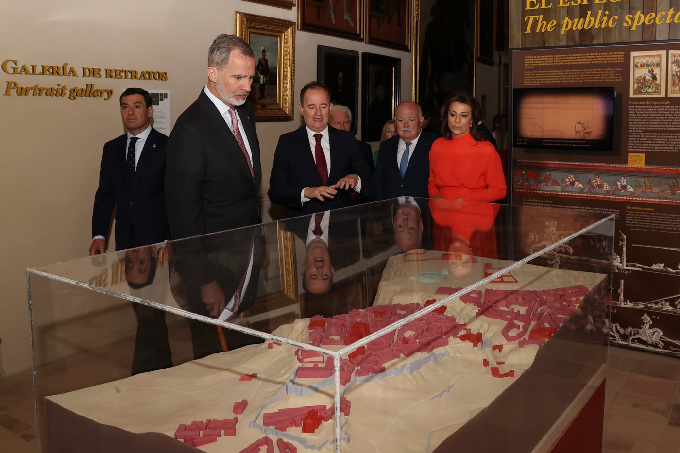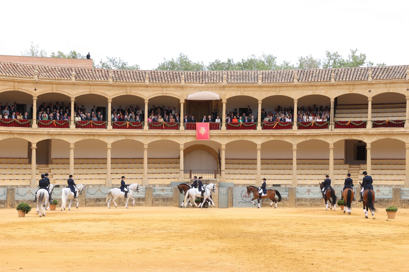 A continuación, se interpretó la Marcha Real y don Felipe, desde el Palco Real, presenció una exhibición de la Escuela de Equitación de la Real Maestranza de Ronda y visitó los Chiqueros, los Corrales y el Museo. También saludó a los empleados de taquilla y mantenimiento de la Real Maestranza de Ronda y a un grupo de los jinetes de la Escuela de Equitación, finalizando esta visita con un encuentro con los asistentes.