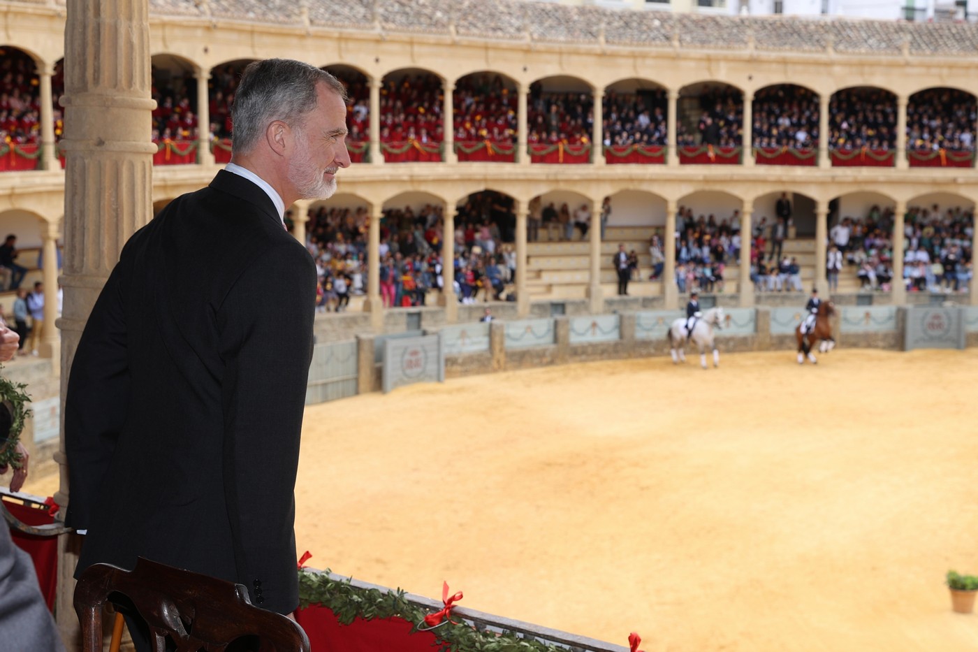 Este miércoles tuvo lugar en Ronda (Málaga) la reunión de las Cinco Reales Maestranzas de Caballería, en el marco de la celebración por el 450º aniversario de la Real Maestranza de Caballería de la localidad malagueña. El Rey fue recibido por el presidente de la Junta de Andalucía, Juan Manuel Moreno Bonilla, entre otras autoridades.