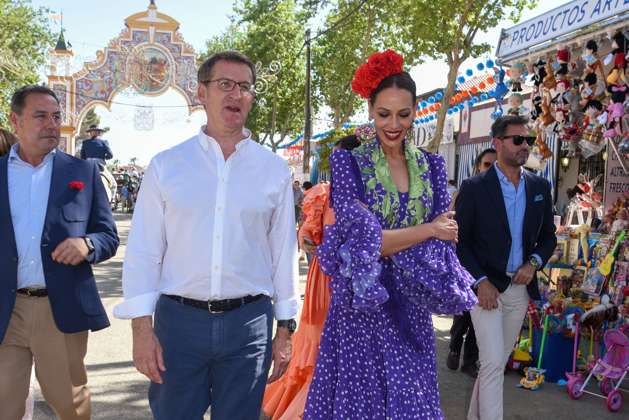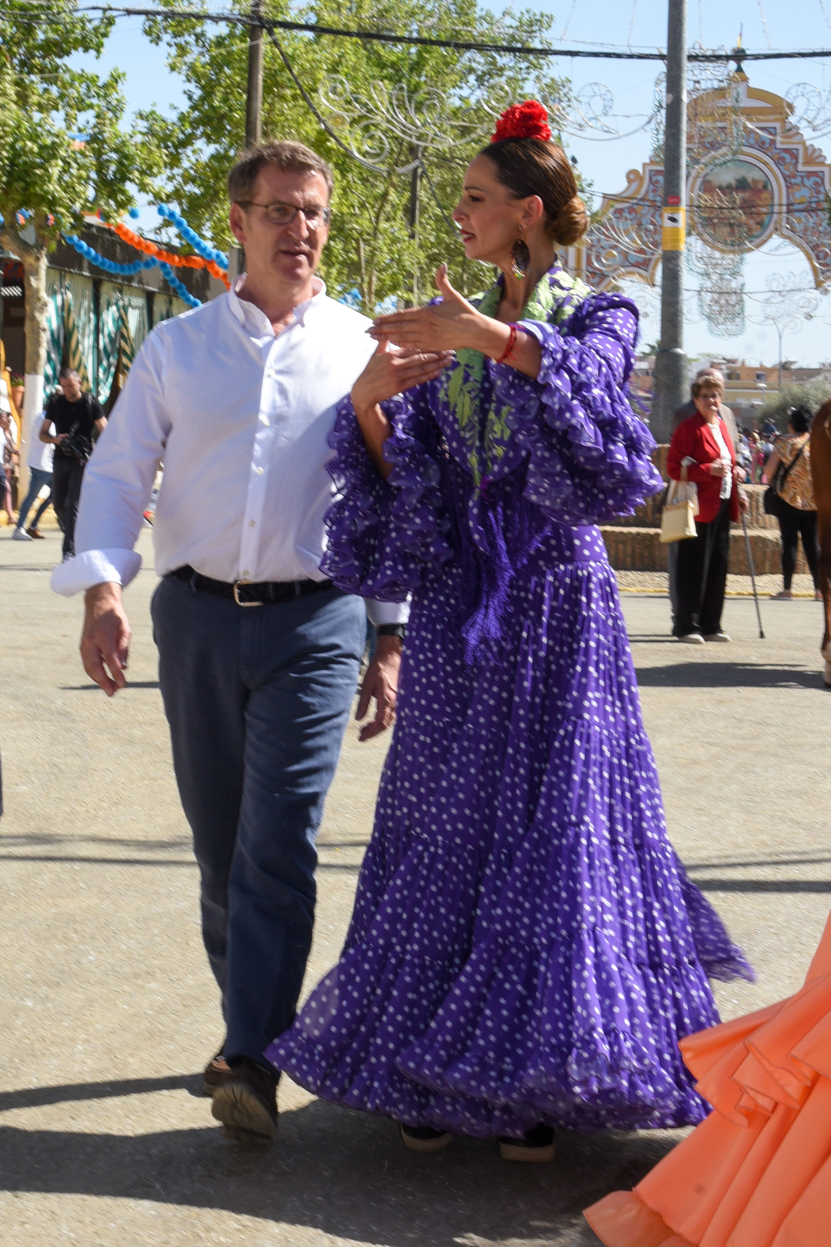 La presentadora coincidió con el presidente del PP, Alberto Núñez-Feijóo, que el mismo día participó en un acto de su partido junto al presidente de la Junta de Andalucía, Juanma Moreno. Las cámaras les fotografiaron paseando por el real y charlando animadamente mientras recorrían algunas casetas.