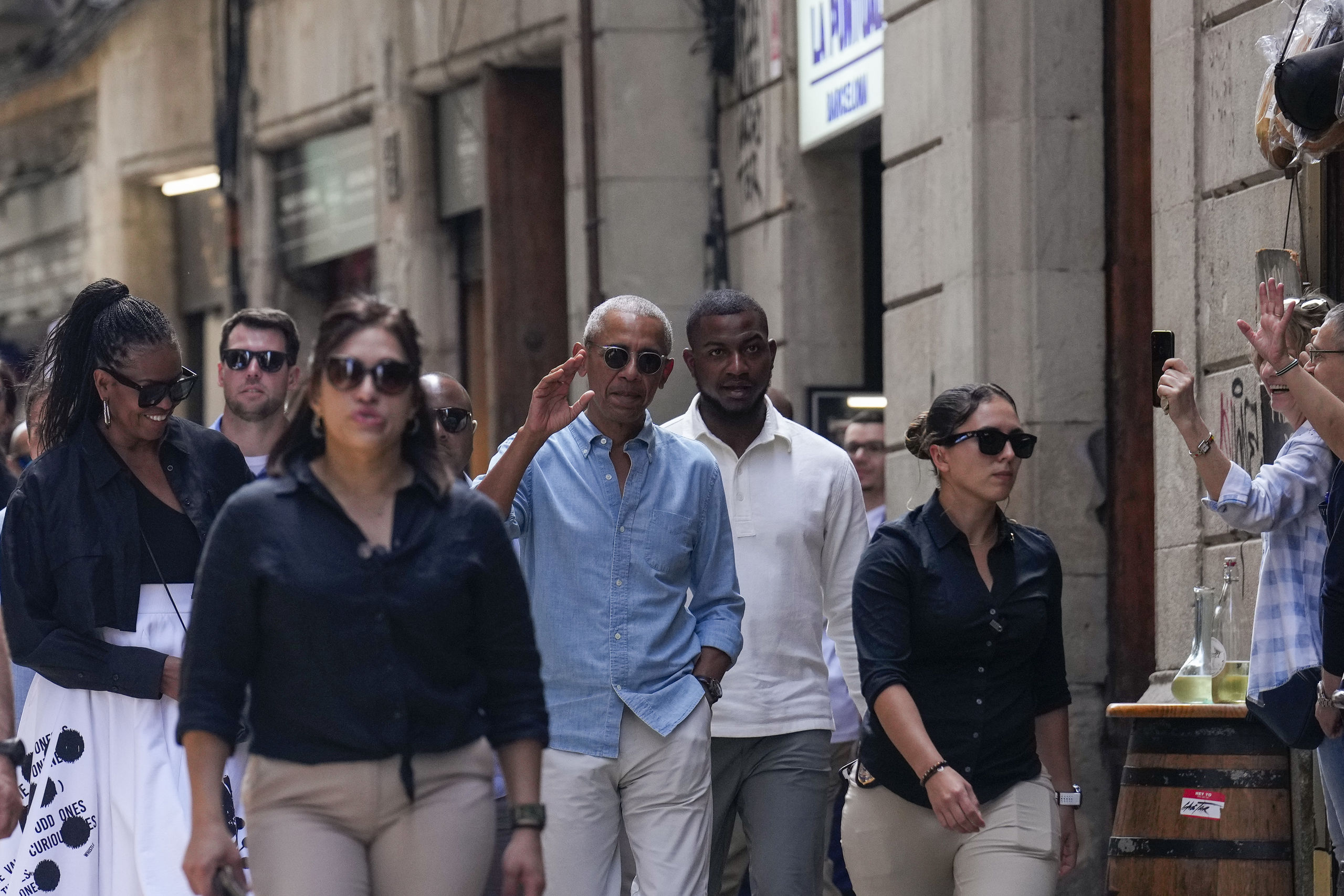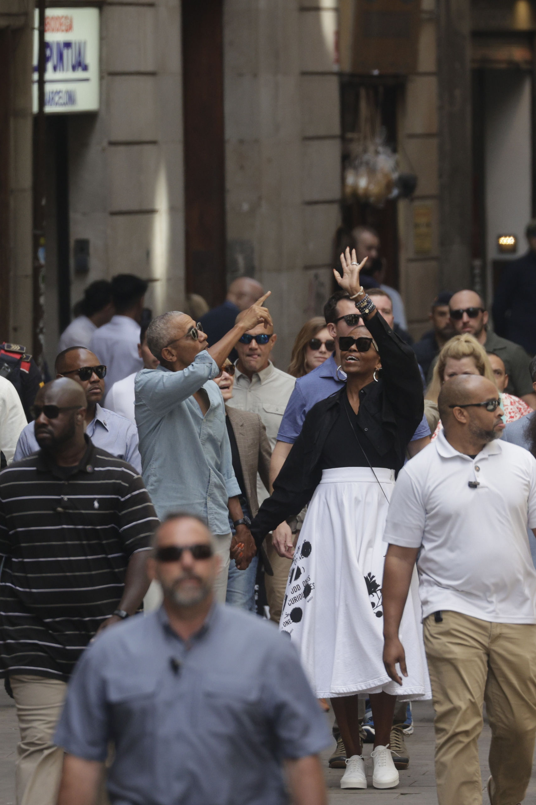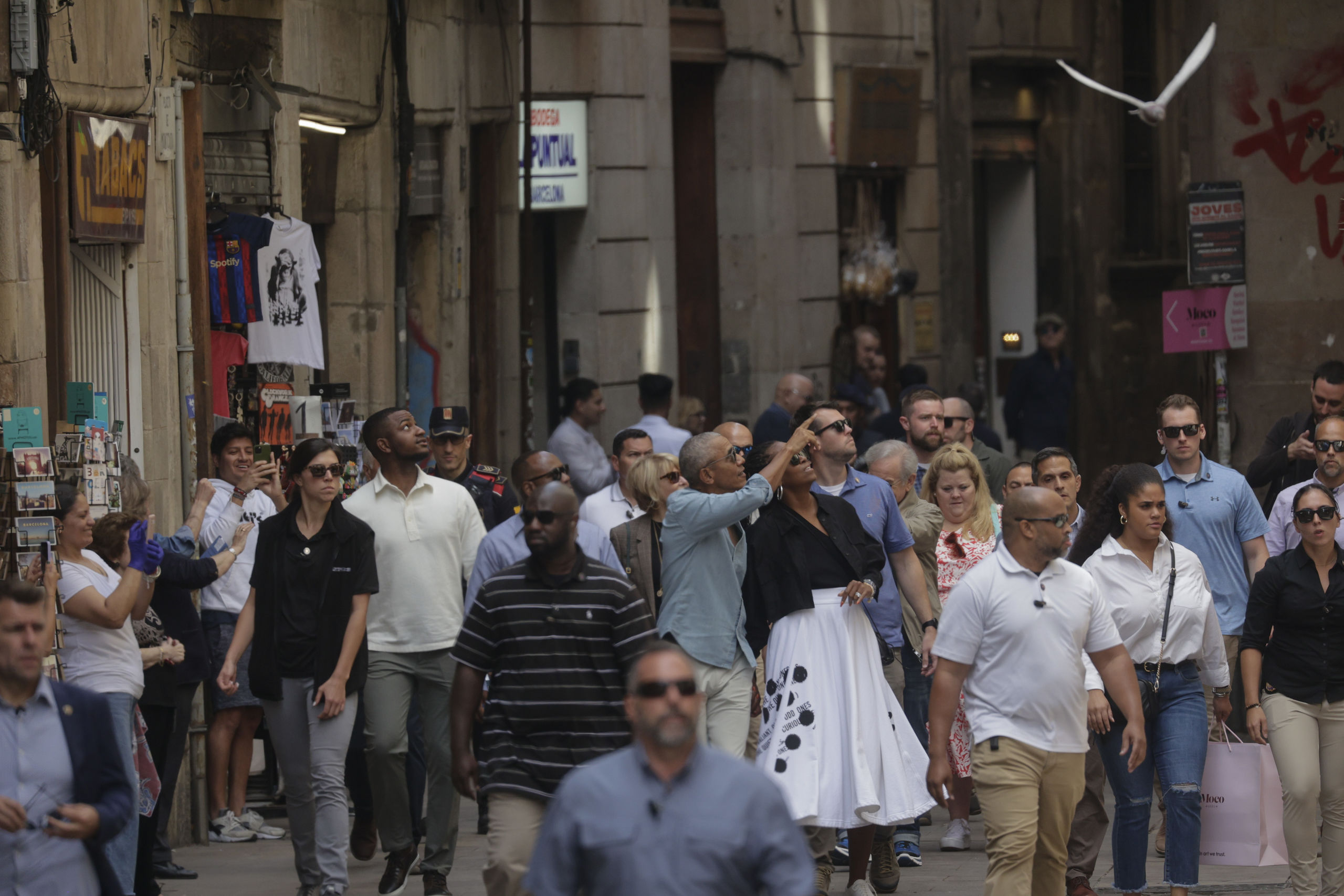 Los barceloneses y turistas que en ese momento se encontraban en la calle Montcada han quedado sorprendidos ante la presencia de los Obama y del séquito de agentes de seguridad que les acompañaba.