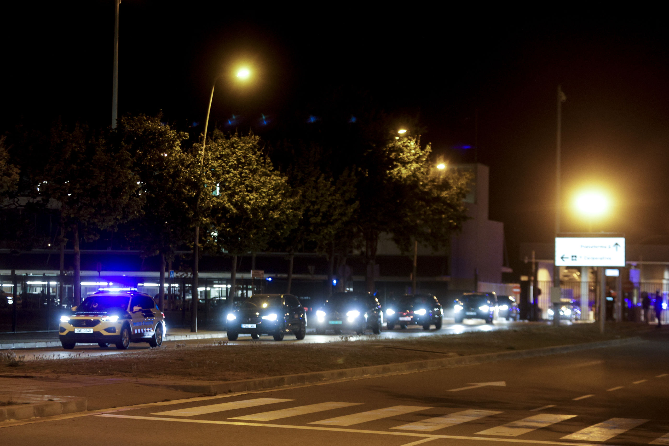 Una larga fila de coches de seguridad aguarda al expresidente de los Estados Unidos y el director de cine, que llegaron en avión privado a España.
