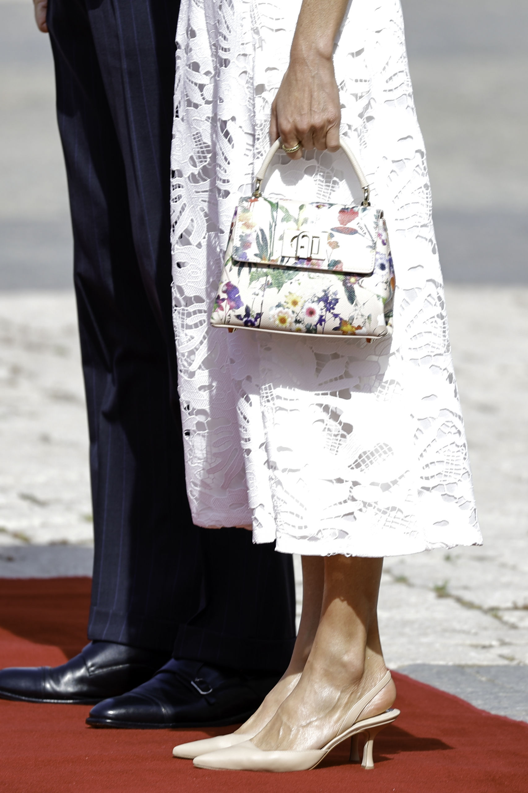 En cuanto al calzado, doña Letizia se ha decantado por un tacón midi perteneciente a la princesa Leonor. En concreto, los slingbacks en tono nude que hemos visto en la princesa en más de una ocasión.