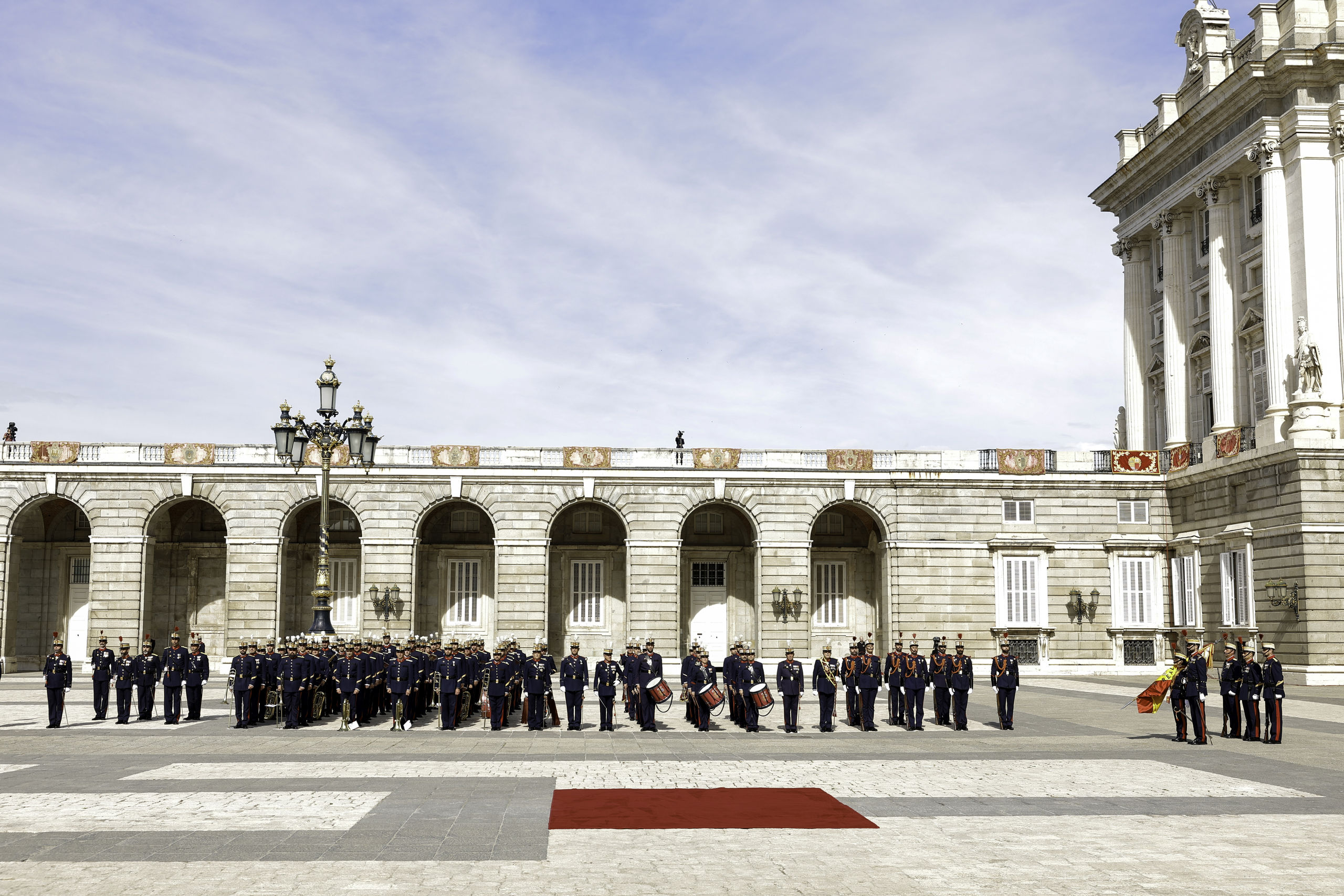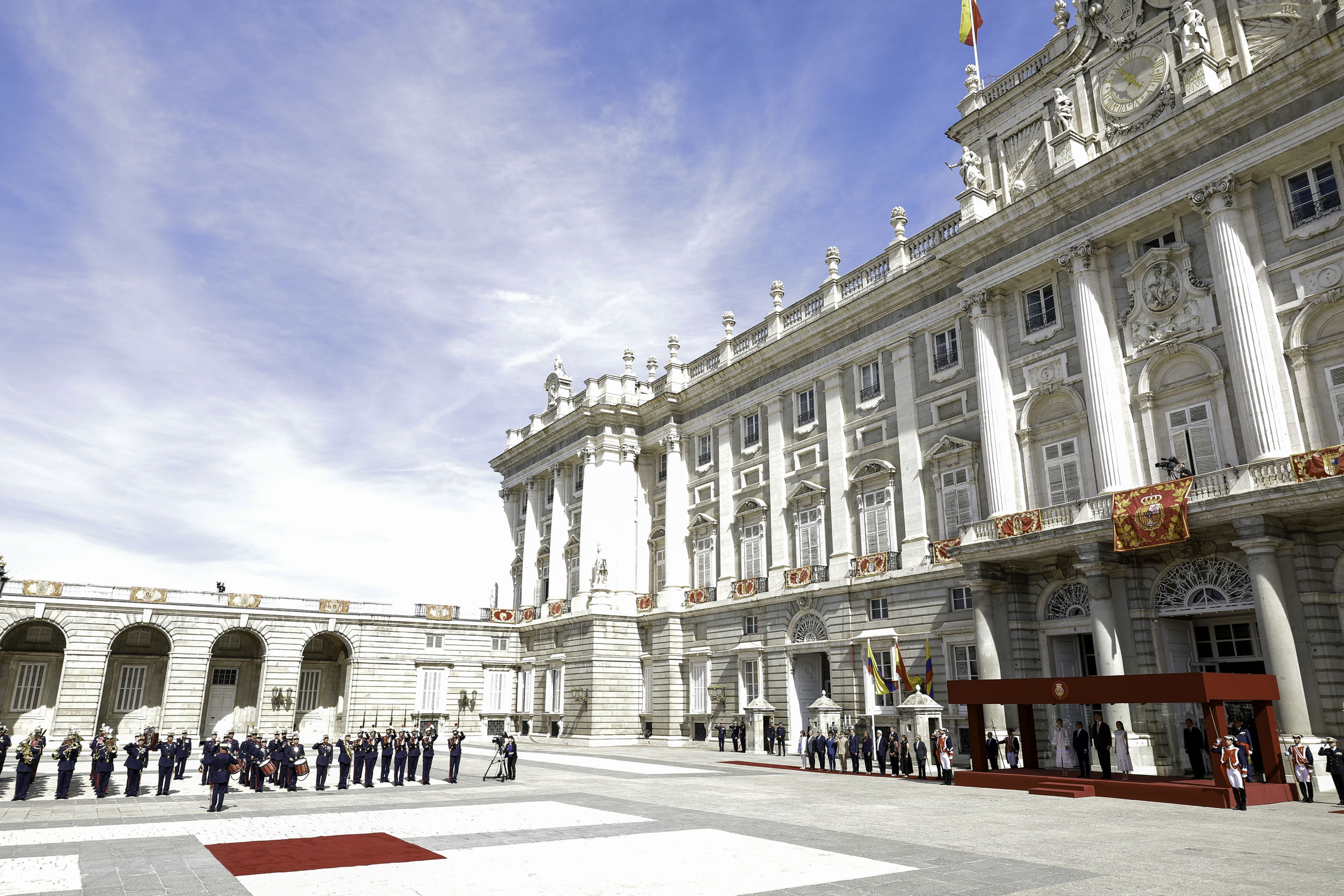 El recibimiento oficial se ha completado con el pase de revista a la compañía de honores de la Guardia Real por parte de los dos jefes de Estado, el saludo a las autoridades y una parada militar de las guarniciones que han participado en la ceremonia.