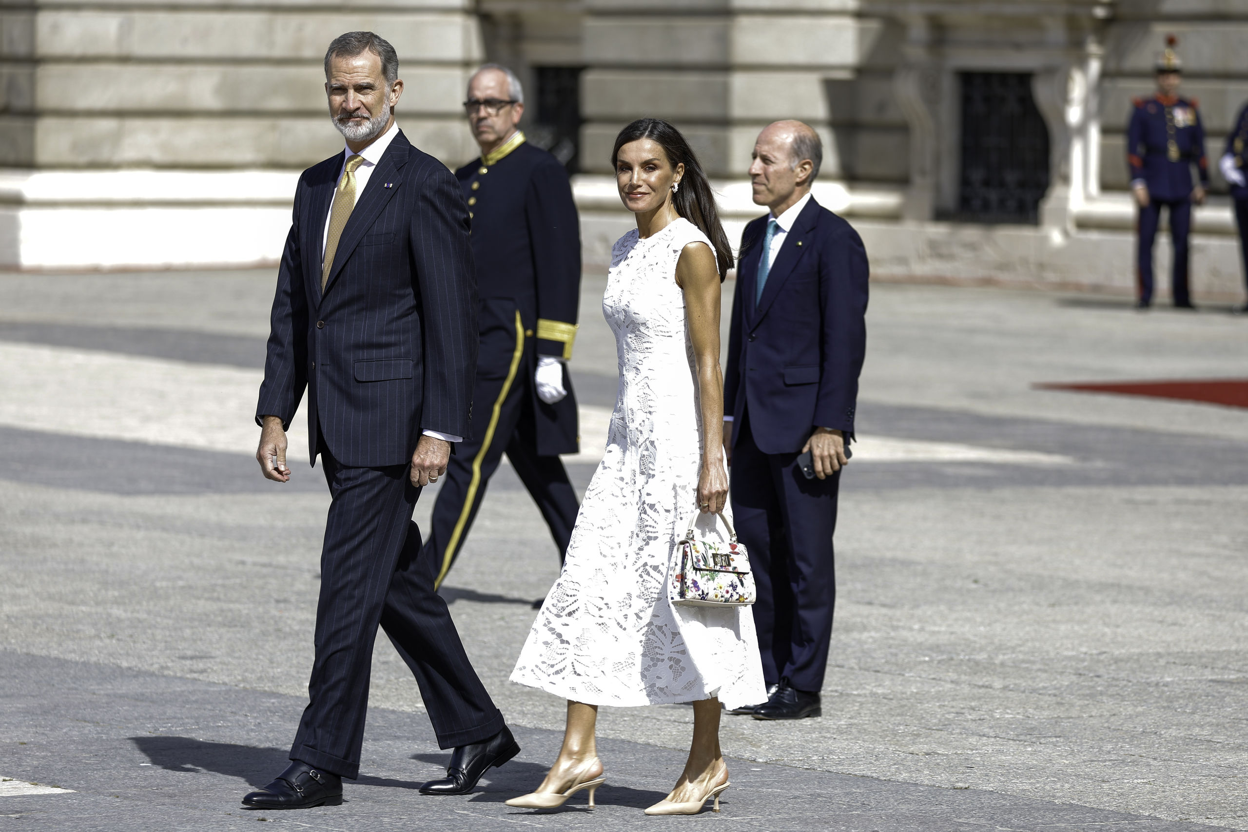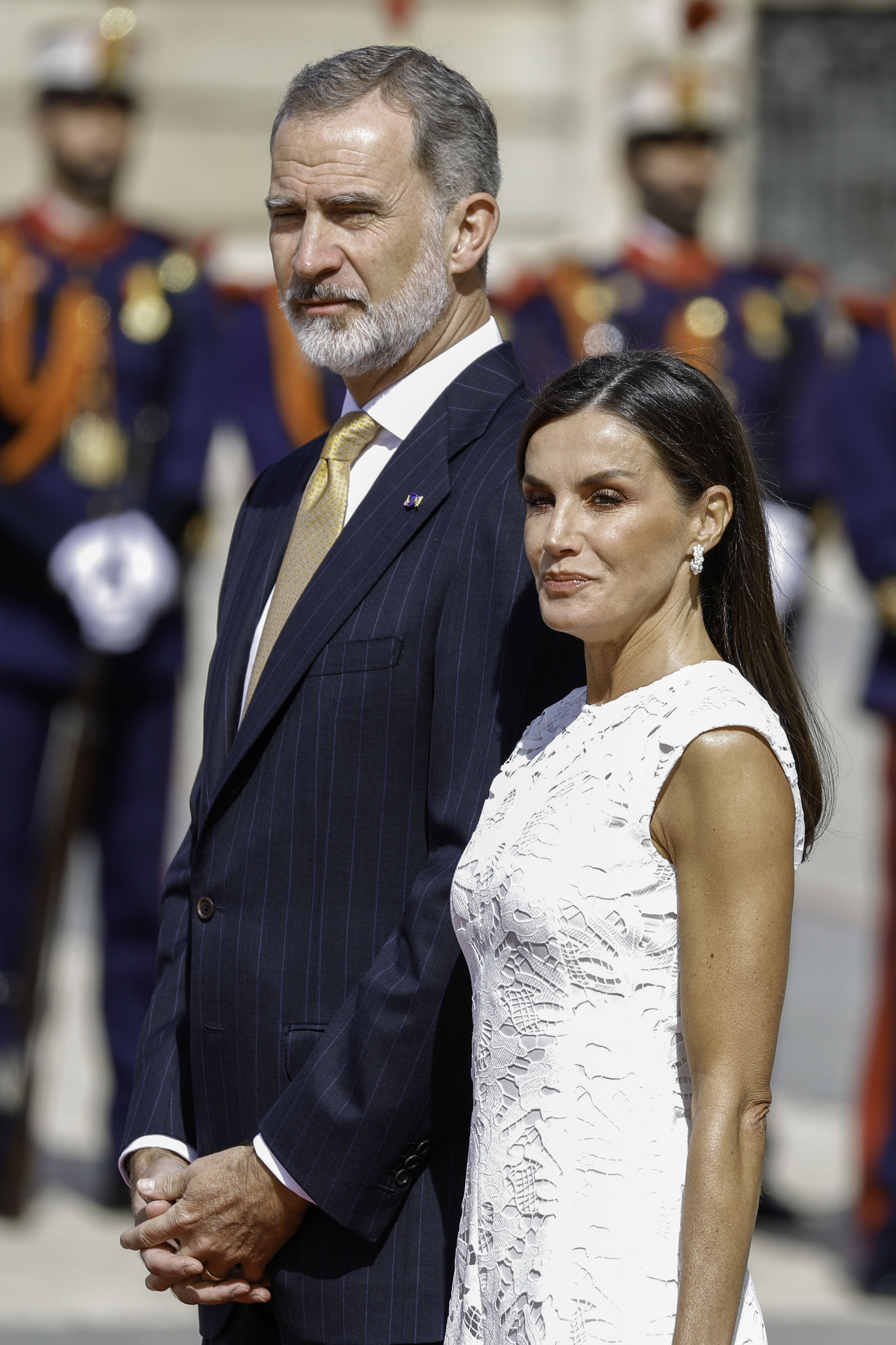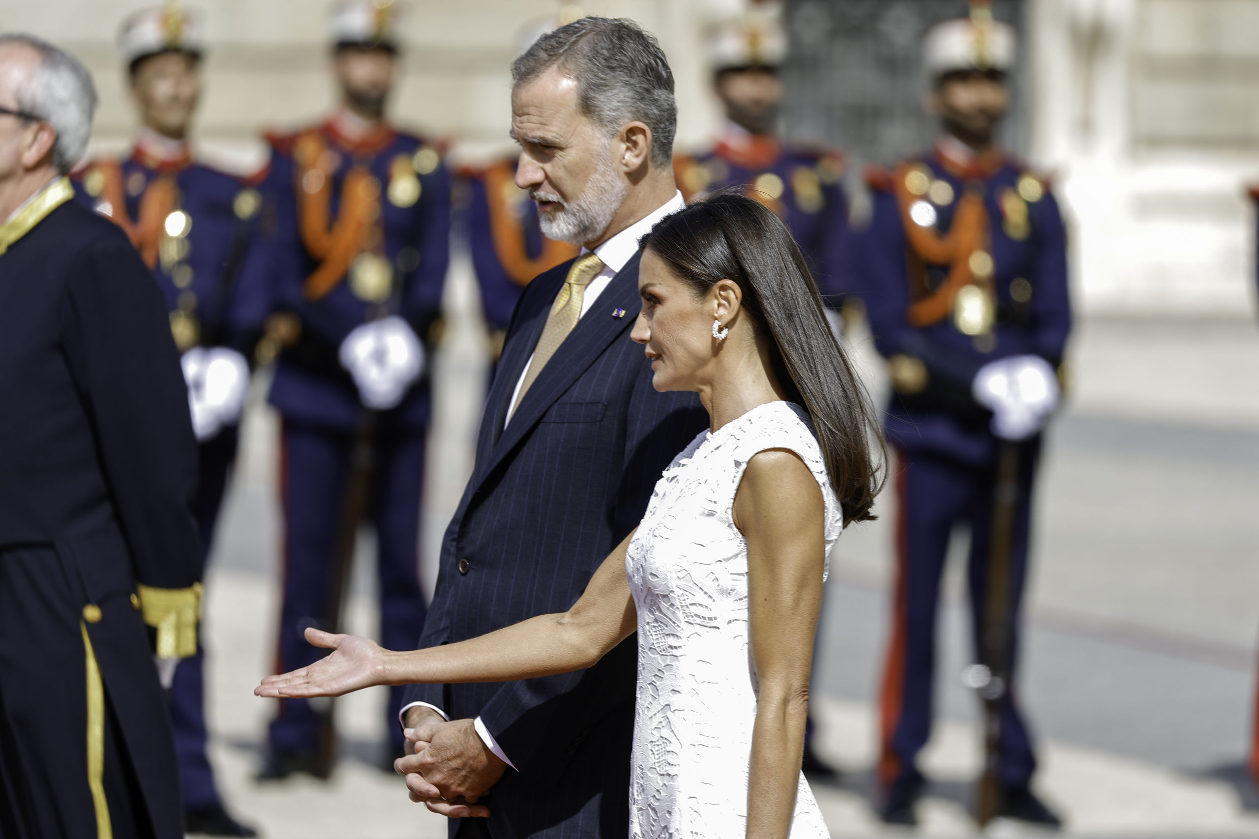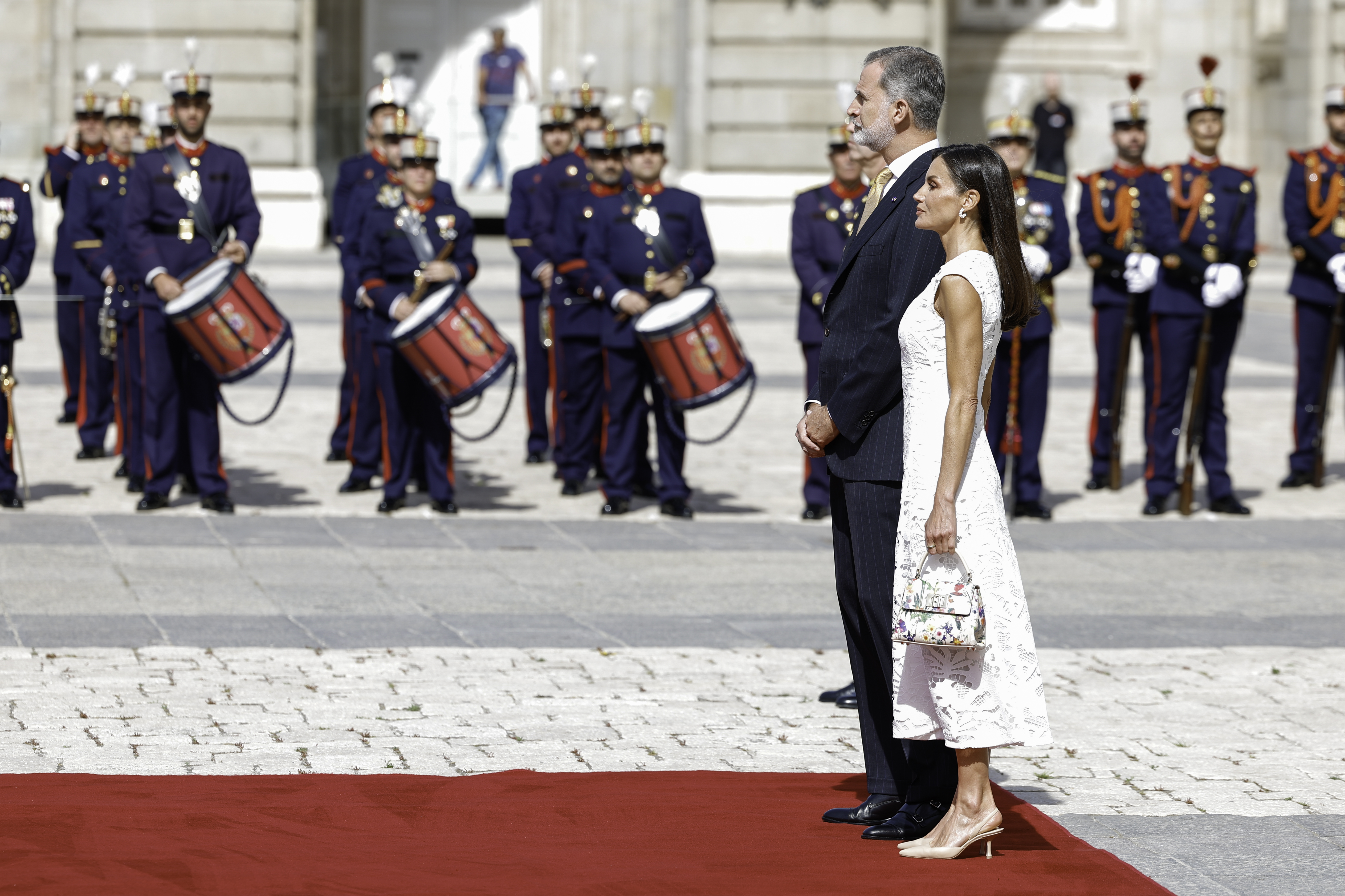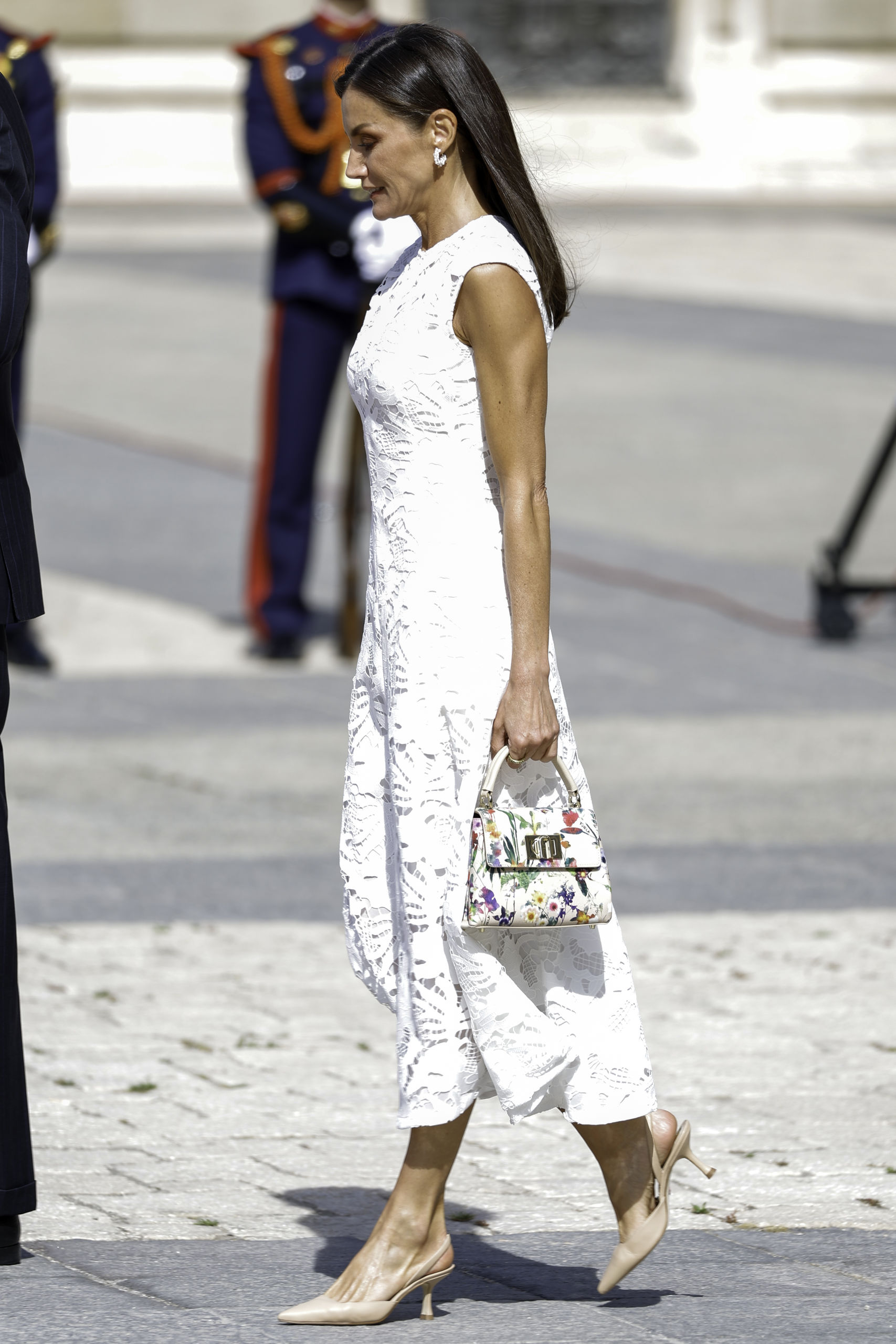 Los reyes han brindado este miércoles la bienvenida oficial al presidente de Colombia, Gustavo Petro, en el Palacio Real con motivo de su primera visita de Estado a España después de que asumiera el poder el pasado mes de agosto. Para esta ocasión la monarca español ha elegido un favorecer y veraniego vestido blanco.