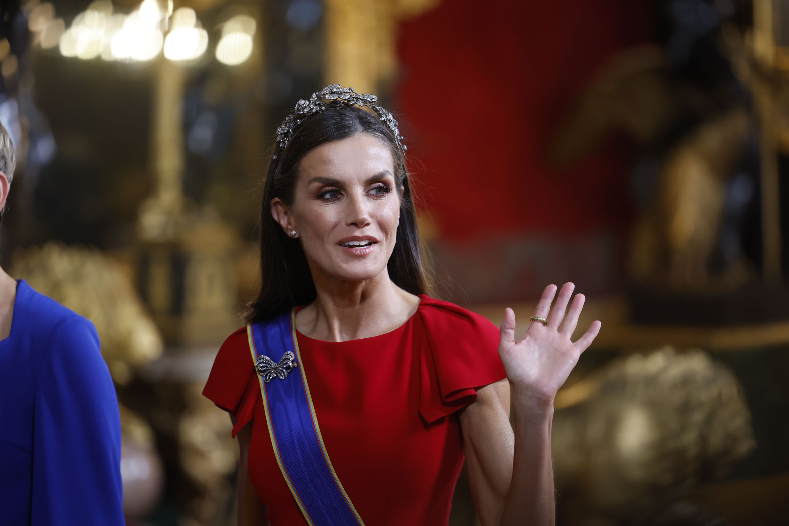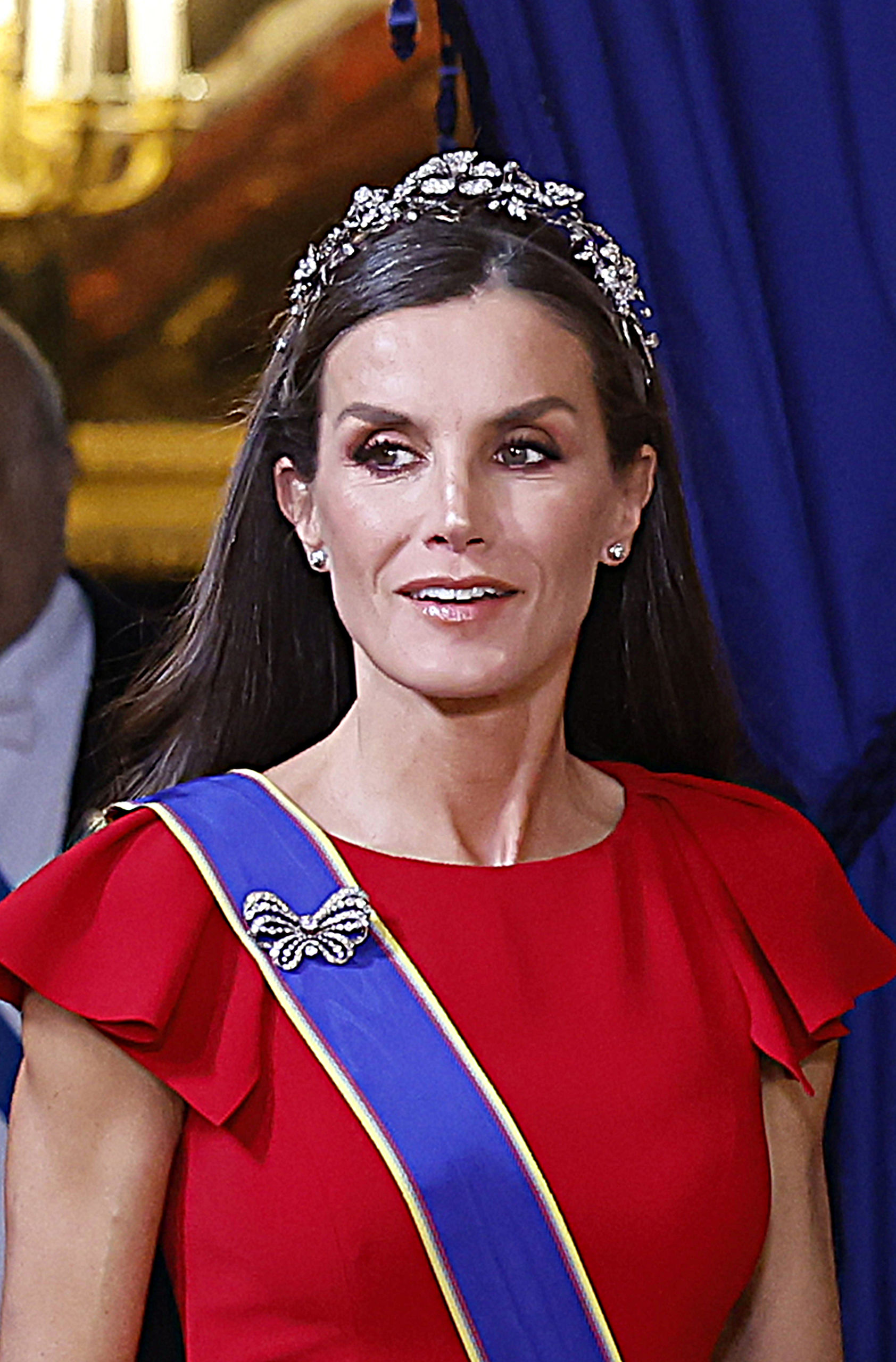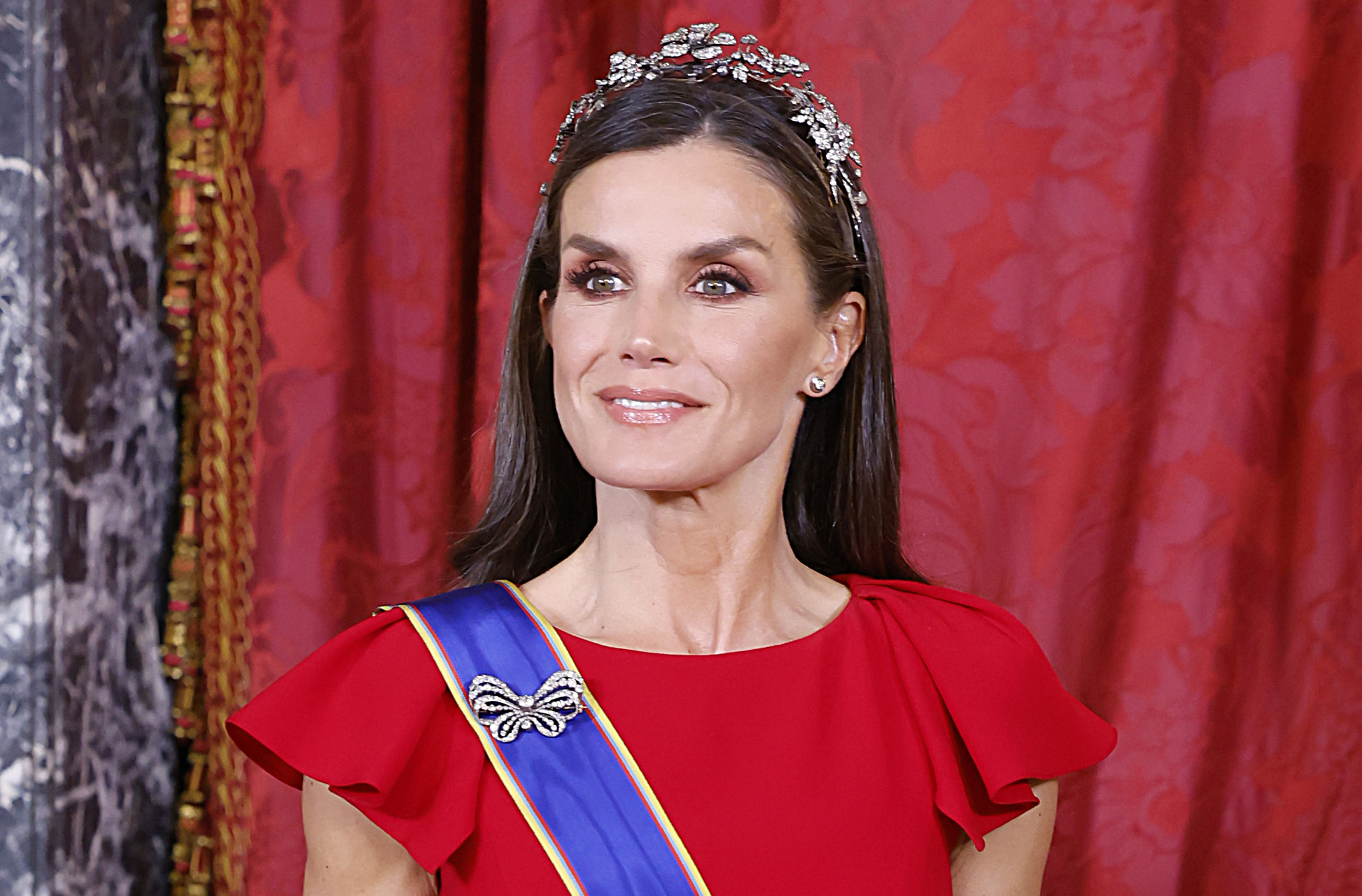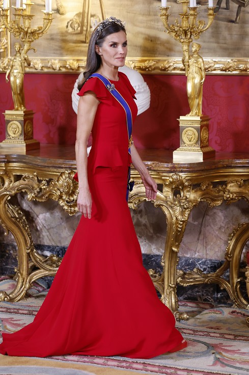 Doña Letizia recupera el rojo y la tiara floral en la cena de gala con el presidente de Colombia