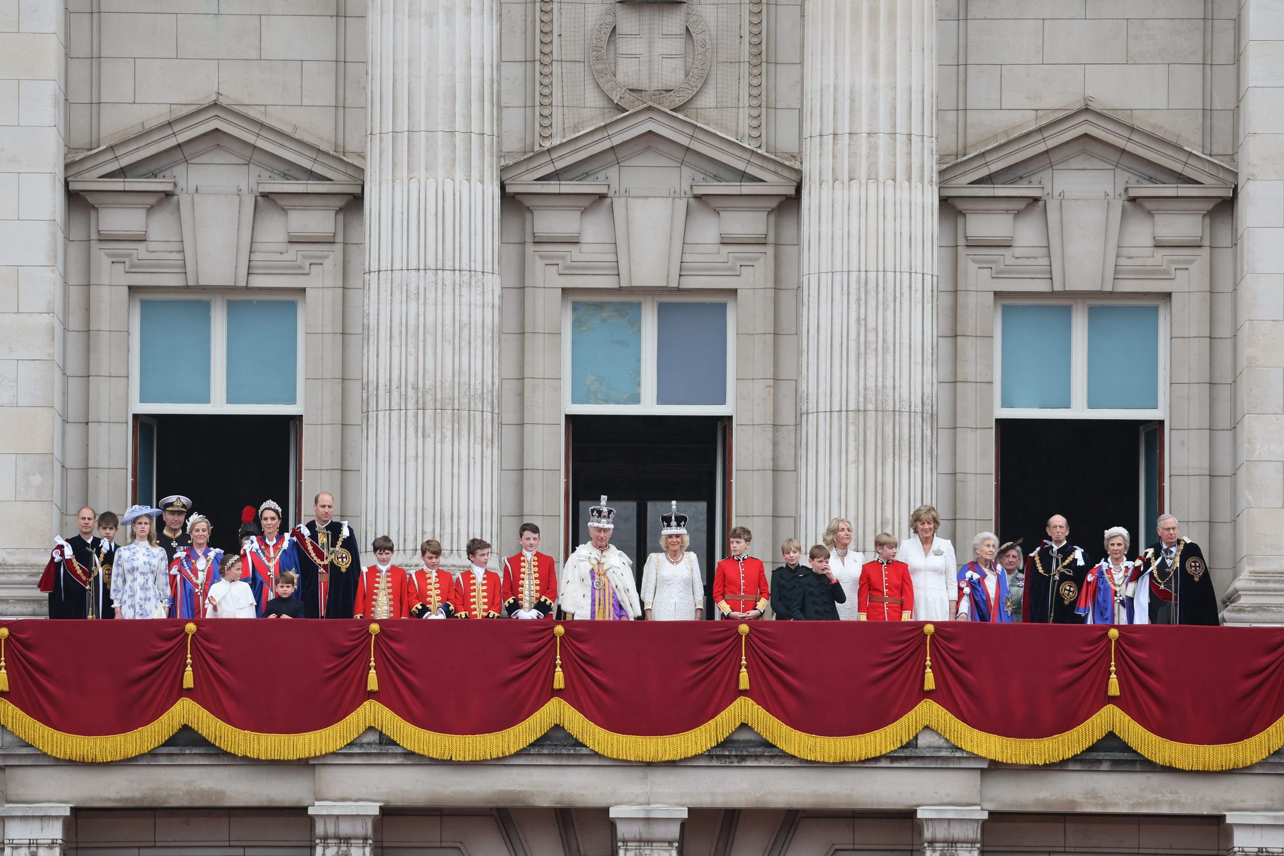 El rey Carlos III ha salido a saludar a la multitud desde el balcón del Palacio de Buckingham junto a la reina Camila y sus familias, pero sin su hijo menor Enrique, apartado de las funciones oficiales de la realeza.