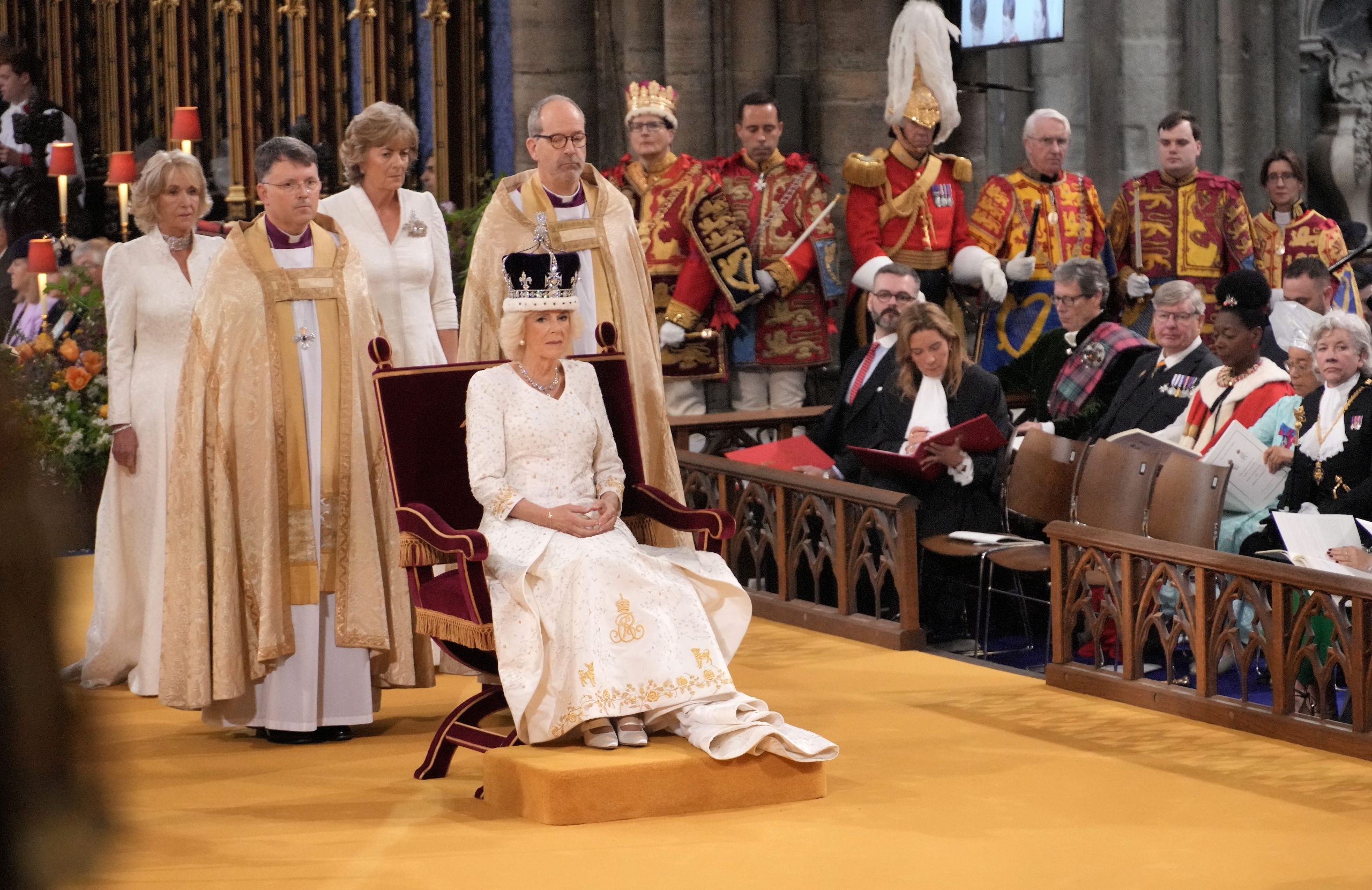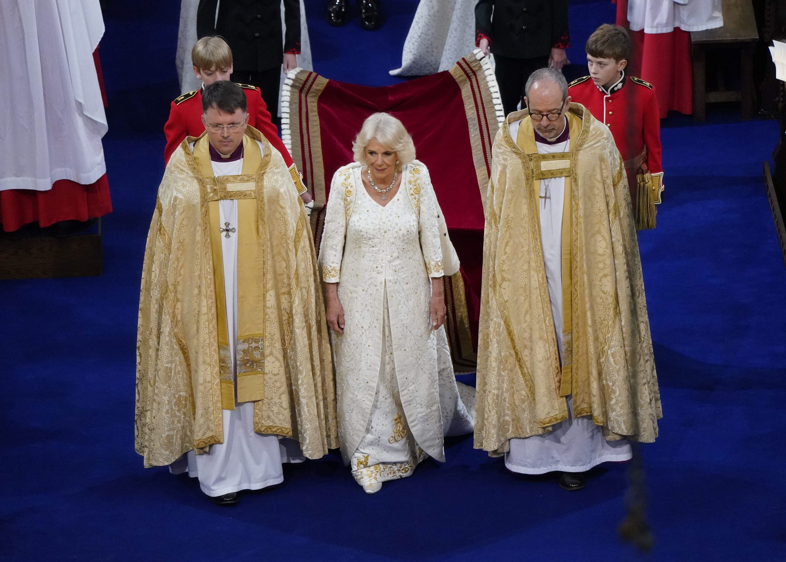 La reina Camila fue primero ungida con aceite en la cabeza por el arzobispo de Canterbury, primado de la Iglesia Anglicana, quien posteriormente impuso en su cabeza la corona de la Reina María. La mujer del rey Carlos III desde hace 18 años deja de esta forma de ser llamada reina consorte, para pasar a ser considerada únicamente como reina. Una sonriente Camila recibió de manos del obispo emérito de Londres y de la obispa de Dover el Cetro de la Reina Consorte y la Vara con Paloma de la Reina Consorte.