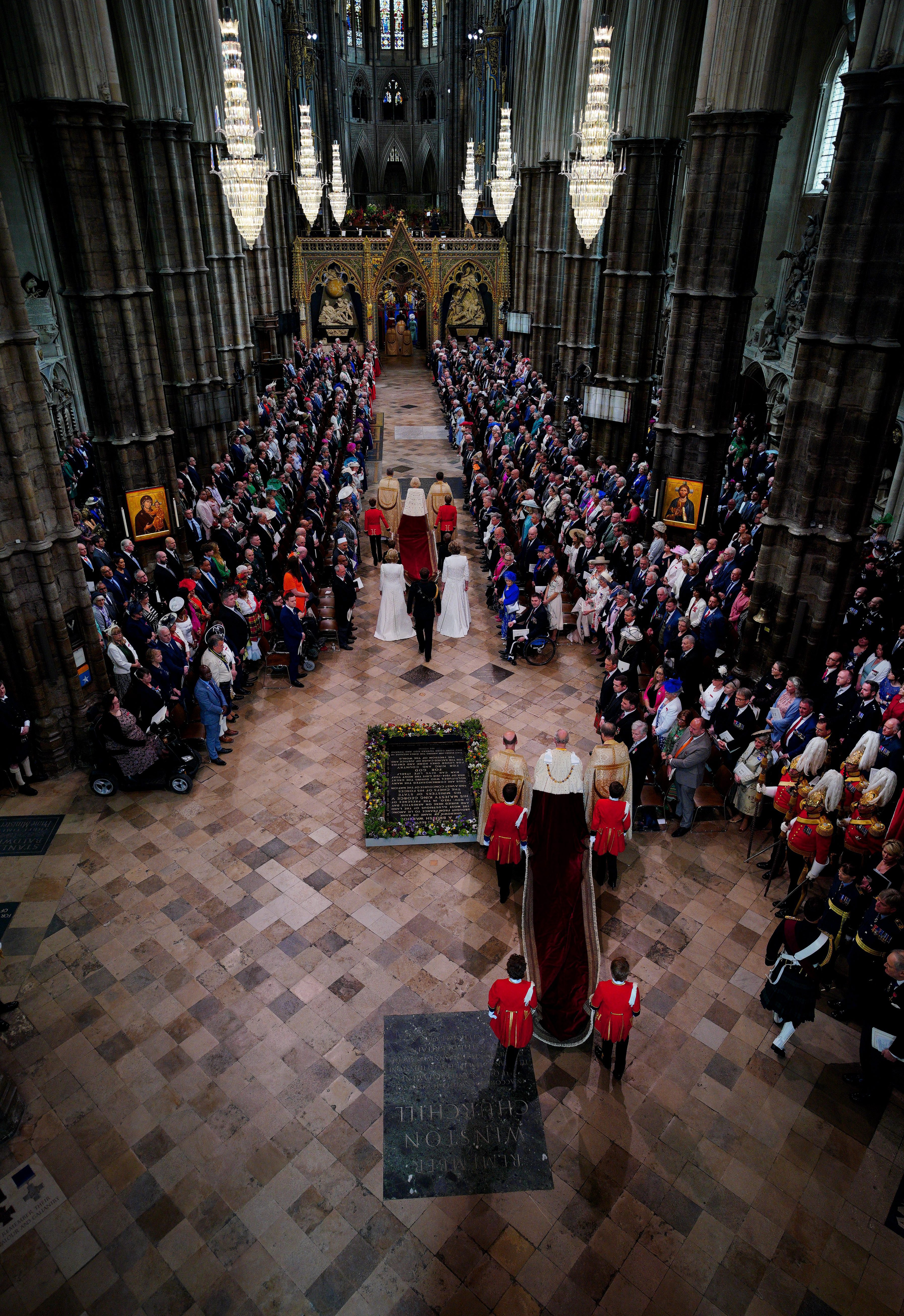 Ataviado con una capa de armiño, el rey Carlos III entró en la abadía seguido por varios niños, entre ellos su nieto, el príncipe Jorge, segundo en la línea de sucesión a la corona británica, que hizo de paje junto con los nietos de Camila.