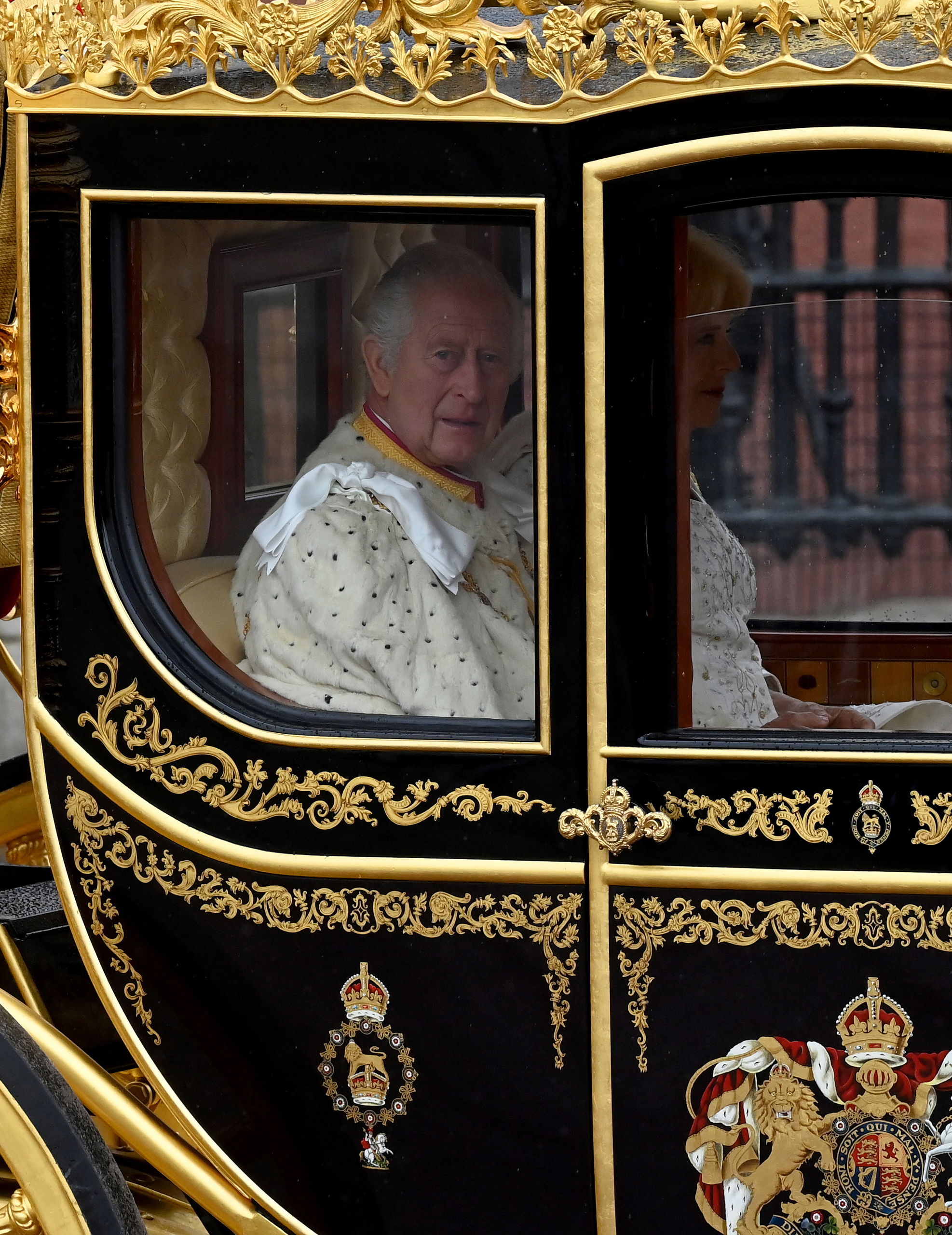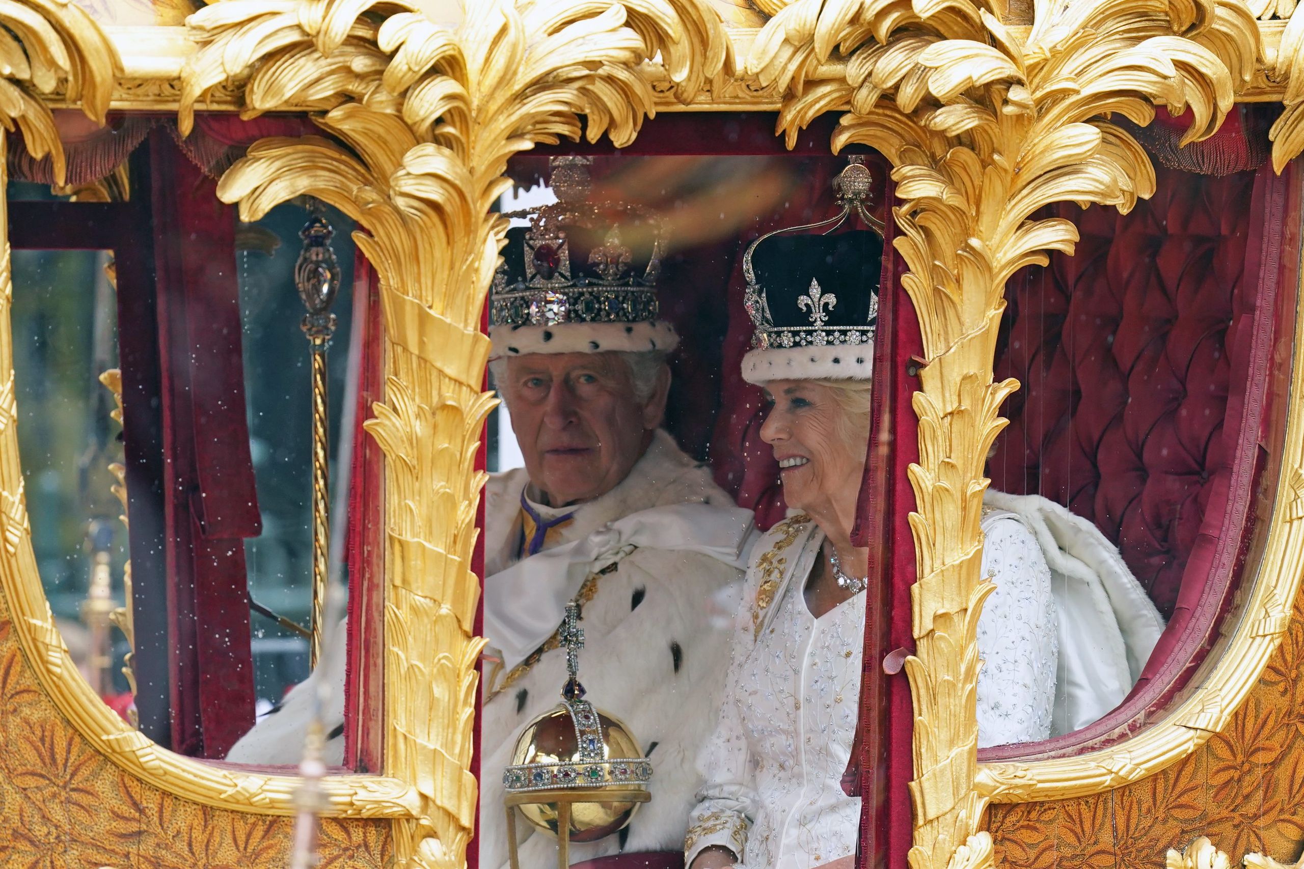 Carlos III y Camila abandonaron esta mañana la Abadía de Westminster tras haber sido coronados como reyes del Reino Unido, e iniciaron la procesión hacia el palacio de Buckingham a bordo de la suntuosa Carroza Dorada de Estado.
