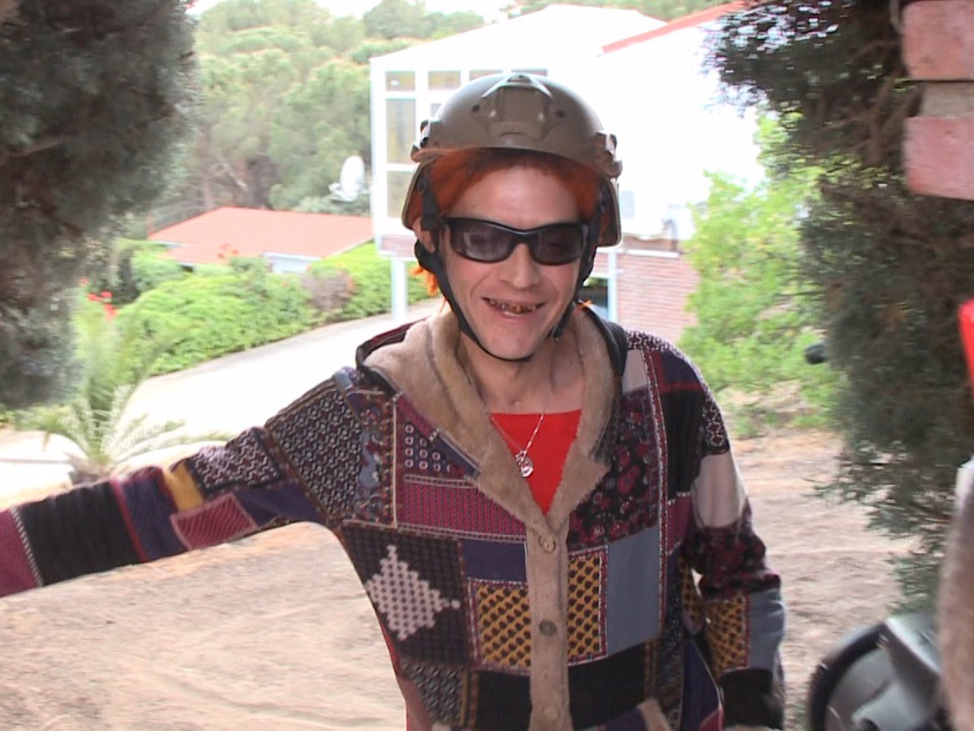 En patinete eléctrico y con un casco de moto rosa con flores que dejaba entrever una peluca pelirroja, el anteriormente conocido como Camilín ha recorrido la calle de la tranquila urbanización en la que reside en la localidad de Torrelodones presumiendo de su nueva identidad.