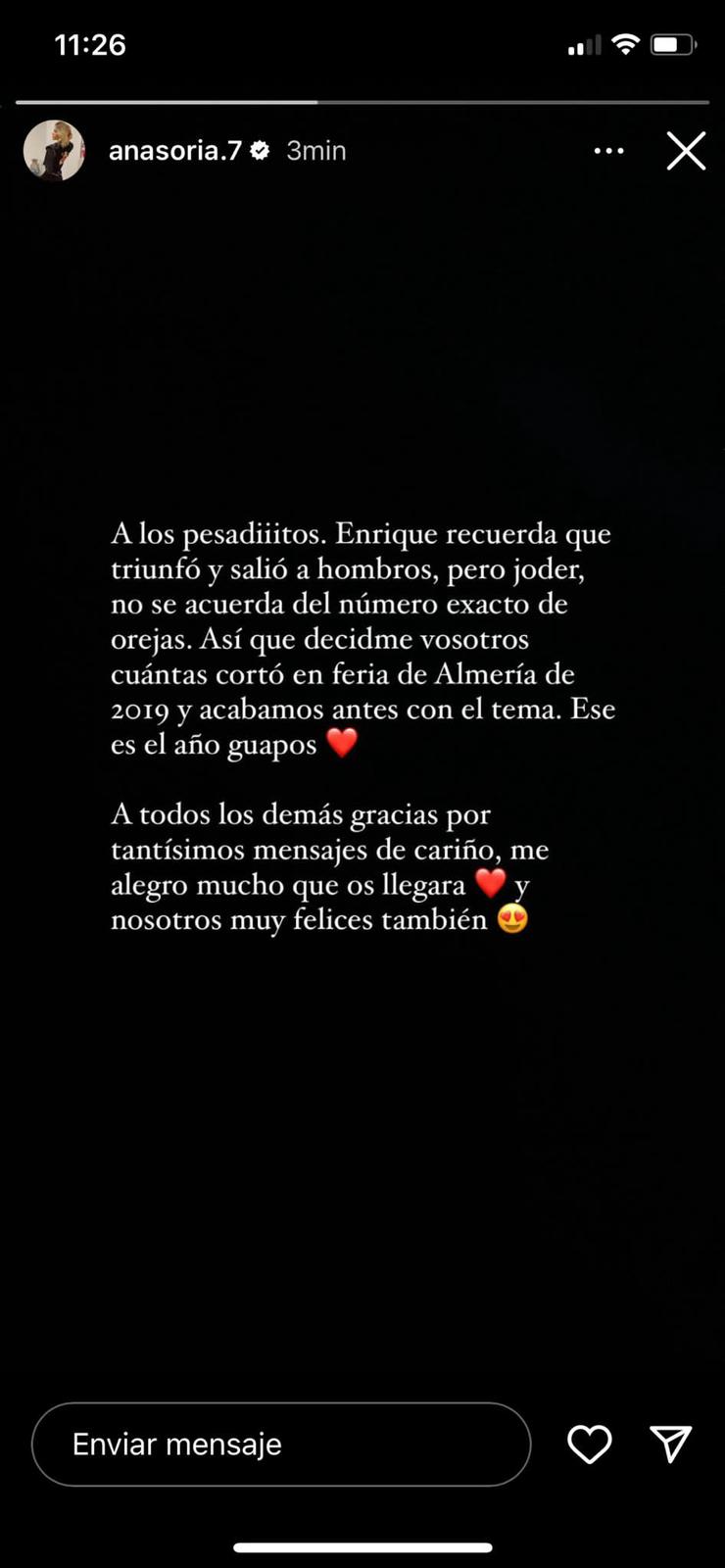 Conscientes de la polémica, habría sido la propia Ana Soria la que, en un mensaje con cierto cariz irónico, trataba de resituar el inicio de la relación. "A los pesadiiitos, Enrique recuerda que triunfó y salió a hombros, pero joder, no se acuerda del número exacto de orejas. Así que decidme vosotros cuántas cortó en la feria de Almería de 2019 y acabamos antes con el tema", escribió la joven Ana Soria.