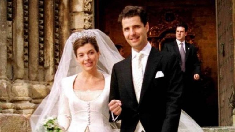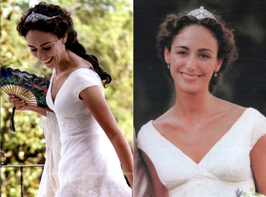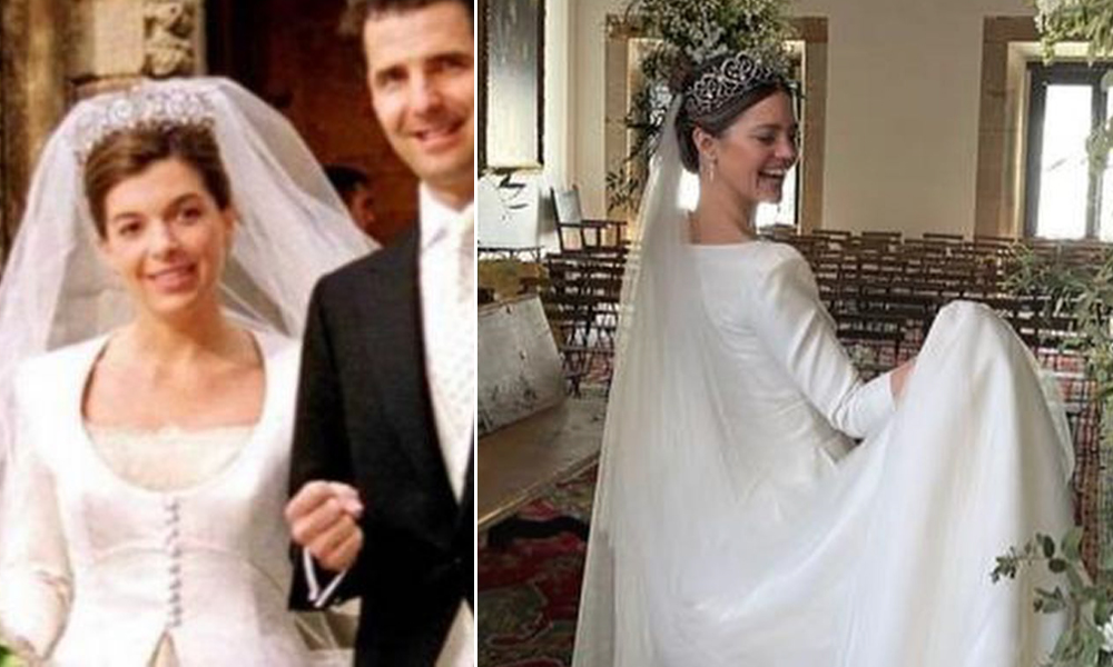 La lució Corsini en su boda con Manuel Falcó, el hermano mayor de Tamara, y se trata de una pieza más pequeña y de forma triangular. Para su enlace con el marqués de Castel-Moncayo en julio de 1999, Corsini eligió un romántico diseño firmado por Lorenzo Caprile de corte imperio y esta diadema que pertenece a su familia y de la que no colgó velo alguno. Se trata de una pieza menos ostentosa que la de Junot y más fácil de llevar, sobre todo teniendo en cuenta el peso que pueden llegar a alcanzar estas creaciones.