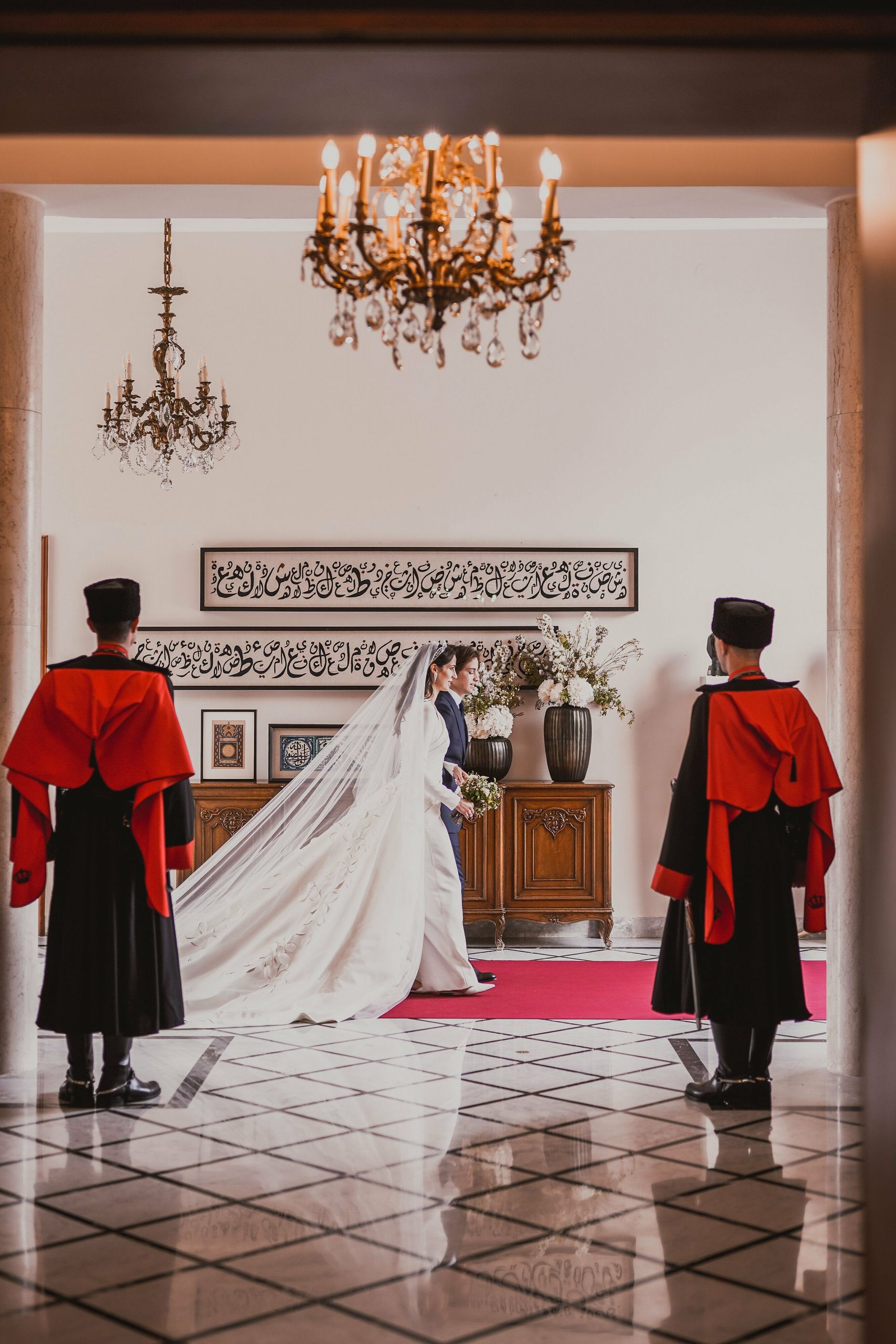 Tras la recepción oficial de los cerca de 140 invitados a la ceremonia, el príncipe heredero Husein bin Abdalá, de 28 años y el mayor de los cuatro hijos de Abdalá II y Rania, llegó a la carpa preparada para el enlace ataviado con el uniforme del Ejército jordano y se sentó junto a su padre para esperar la llegada de la novia.