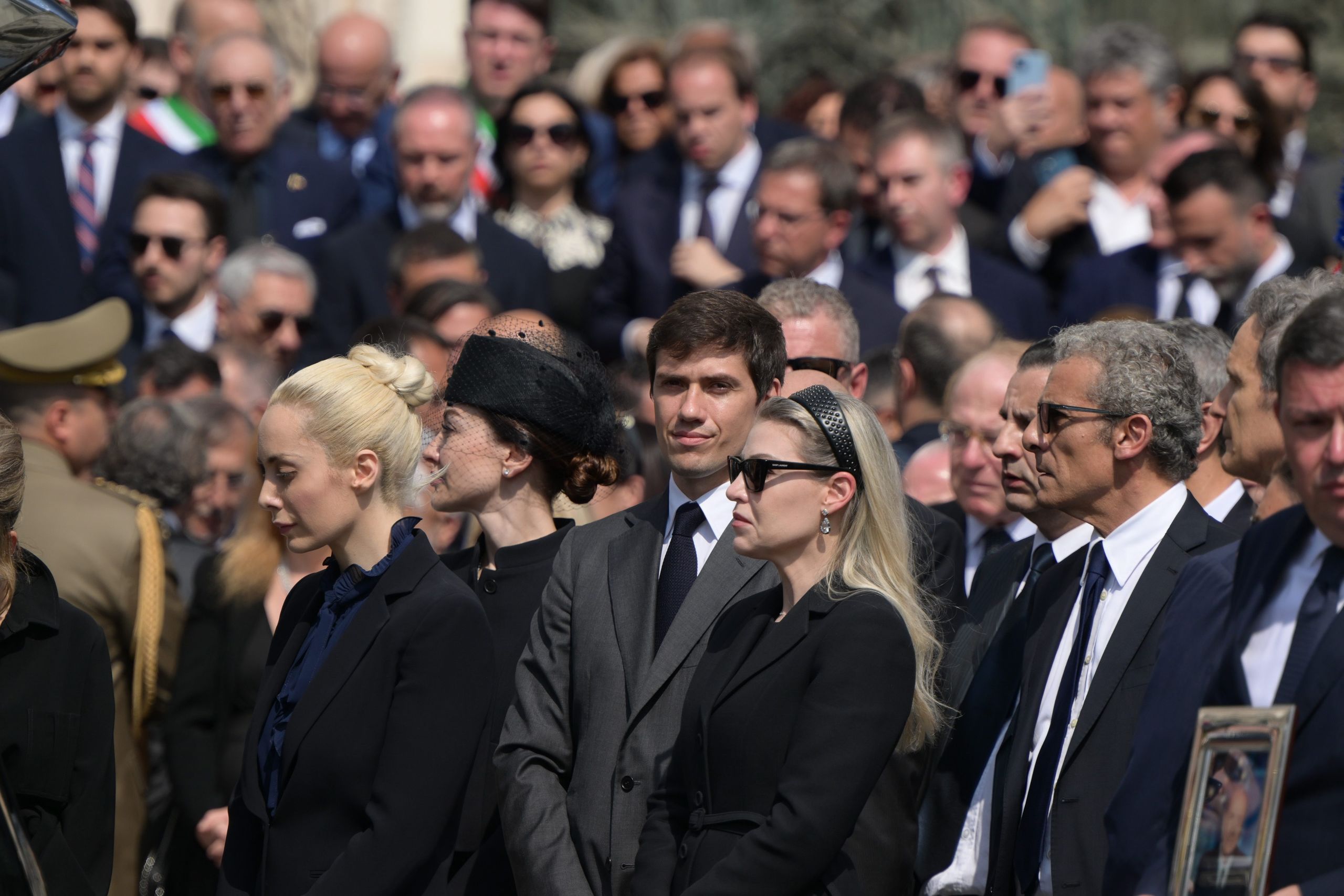 En primera fila se situaron sus cinco hijos: su primogénita, Marina, presidenta de la sociedad de cartera familiar, Fininvest, y su hermano pequeño, Pier Silvio, responsable del emporio televisivo Mediaset, ambos fruto de su primer matrimonio con Carla Dall'Oglio; y los tres hijos que tuvo con la actriz Veronica Lario, Bárbara, Eleonora y Luigi.