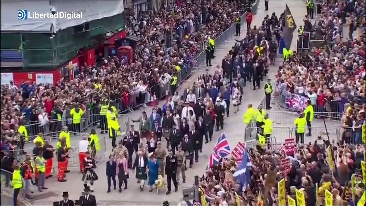 Carlos y Camila, vestidos con los uniformes de la Orden del Cardo, el mayor honor real de Escocia, abandonan la residencia oficial del monarca en Edimburgo, para dirigirse a la catedral. Miles de personas han asistido a la procesión que ha recorrido la Royal Mile, el casco histórico de la ciudad.