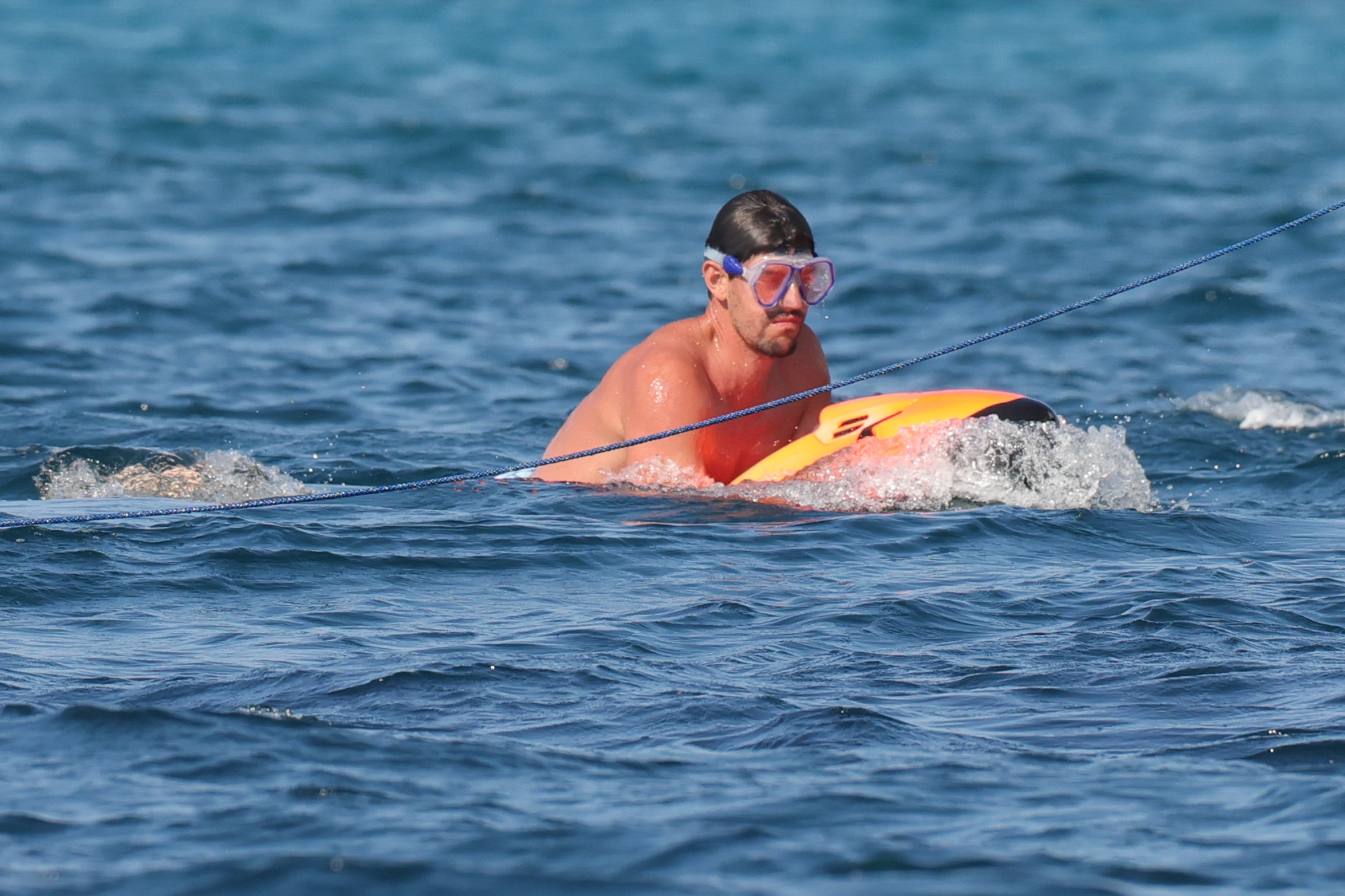 El portero del Real Madrid no dudó en ponerse las gafas de buceo y lanzarse al mar con sus hijos para una jornada de juegos y deportes de agua.