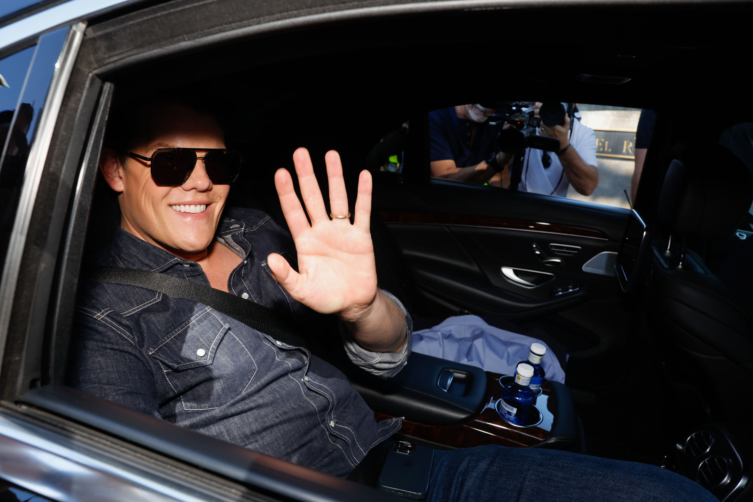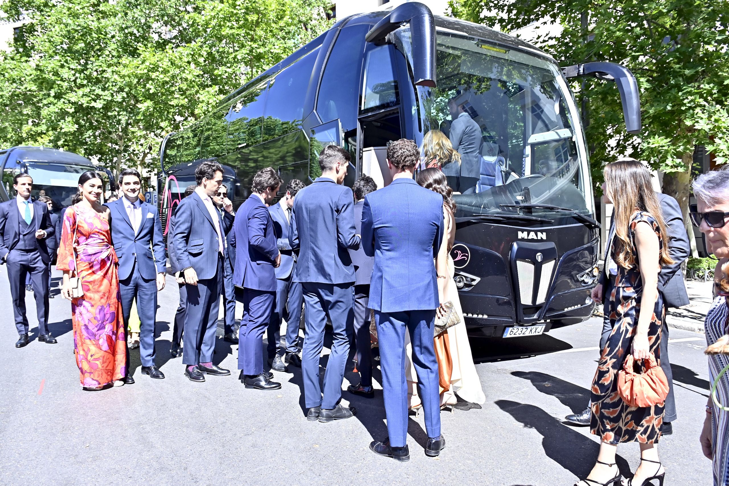 Los invitados suben a los autobuses que los trasladarán desde el Hotel Ritz hasta la finca El Rincón.
