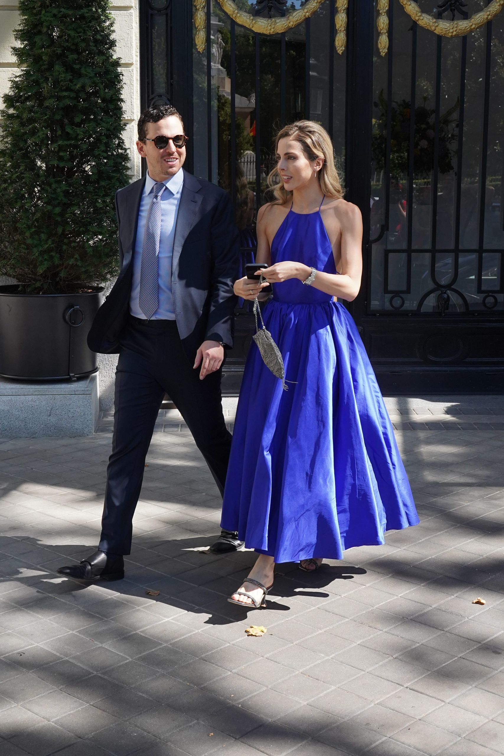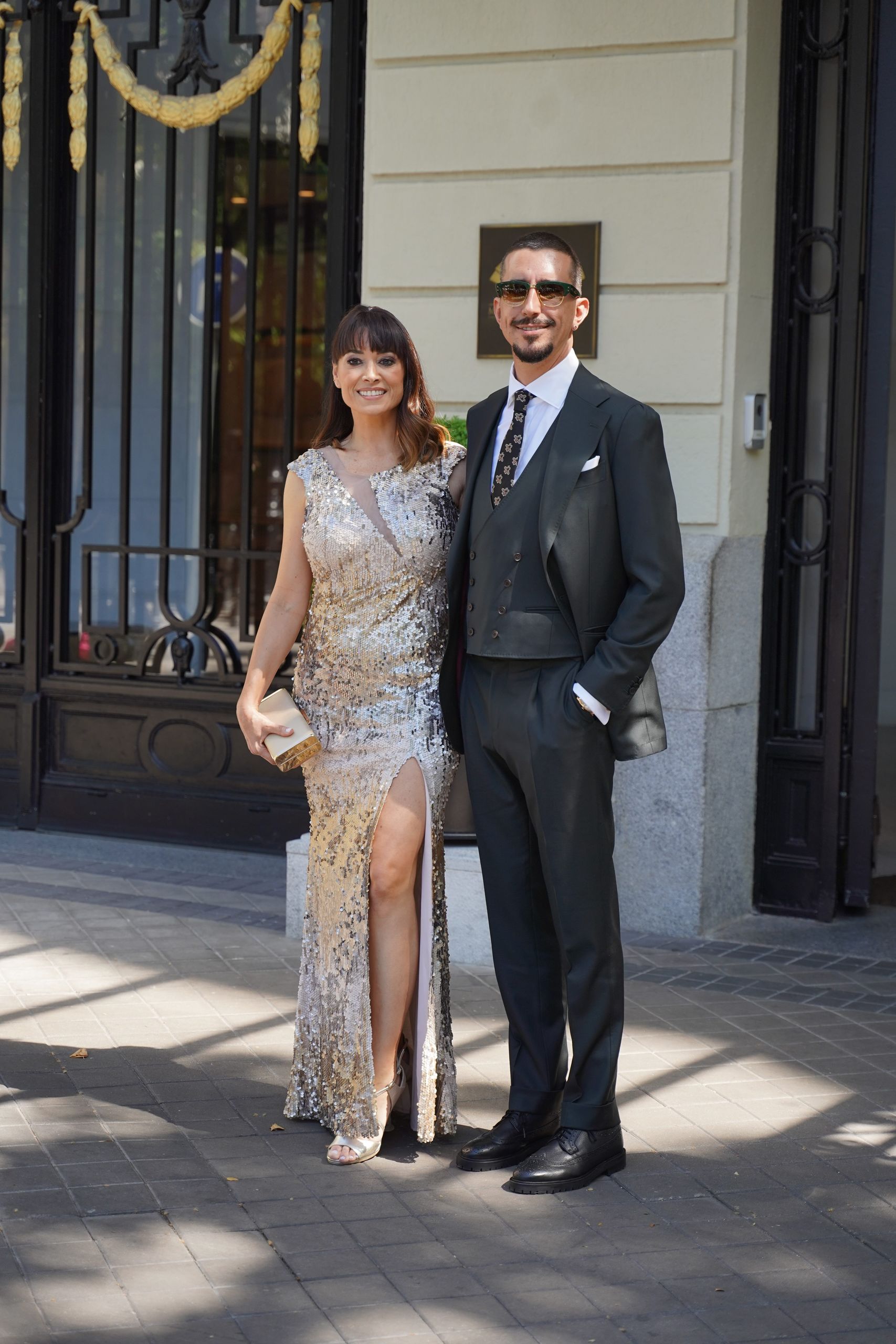 Juan Carlos Naranjo y su pareja, Elisa Ortega, muy original con un llamativo vestido asimétrico azul klein con falda de vuelo.