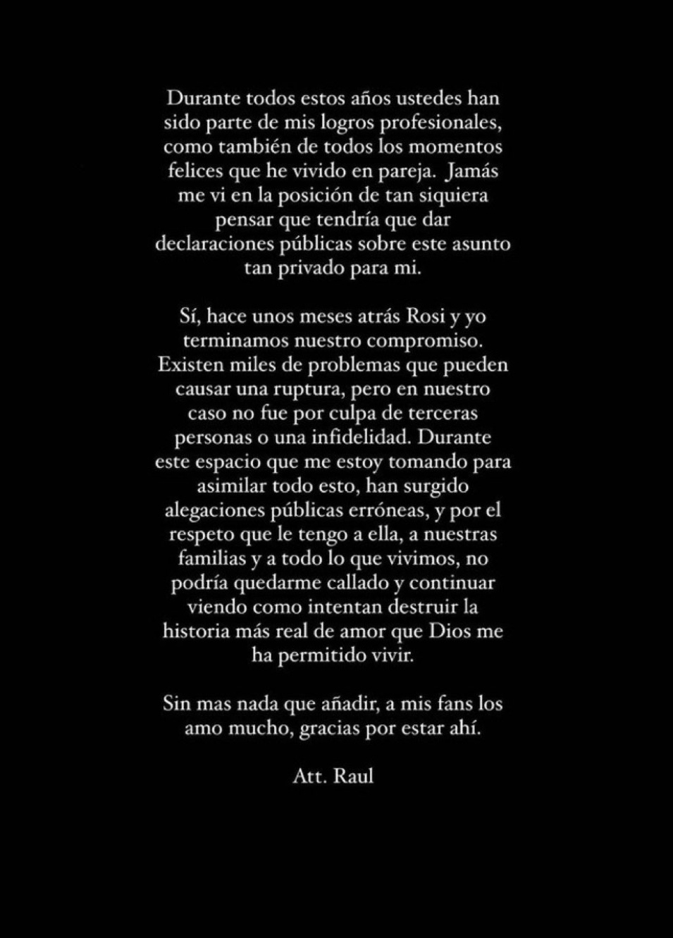 "Durante este espacio que me estoy tomando para asimilar todo esto, han surgido alegaciones públicas erróneas, y por el respeto que le tengo a ella, a nuestras familias y a todo lo que vivimos, no podría quedarme callado y continuar viendo como intentan destruir la historia más real de amor que Dios me ha permitido vivir", continúa el cantante de reggaeton. Y concluye: "Sin más nada que añadir, a mis fans los amo mucho, gracias por estar ahí. Atentamente, Raul".