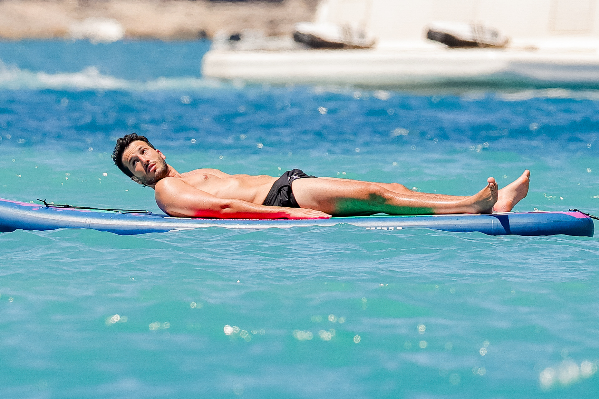 El colombiano se relaja a bordo de una tabla de paddle sobre las tranquilas aguas mediterráneas.