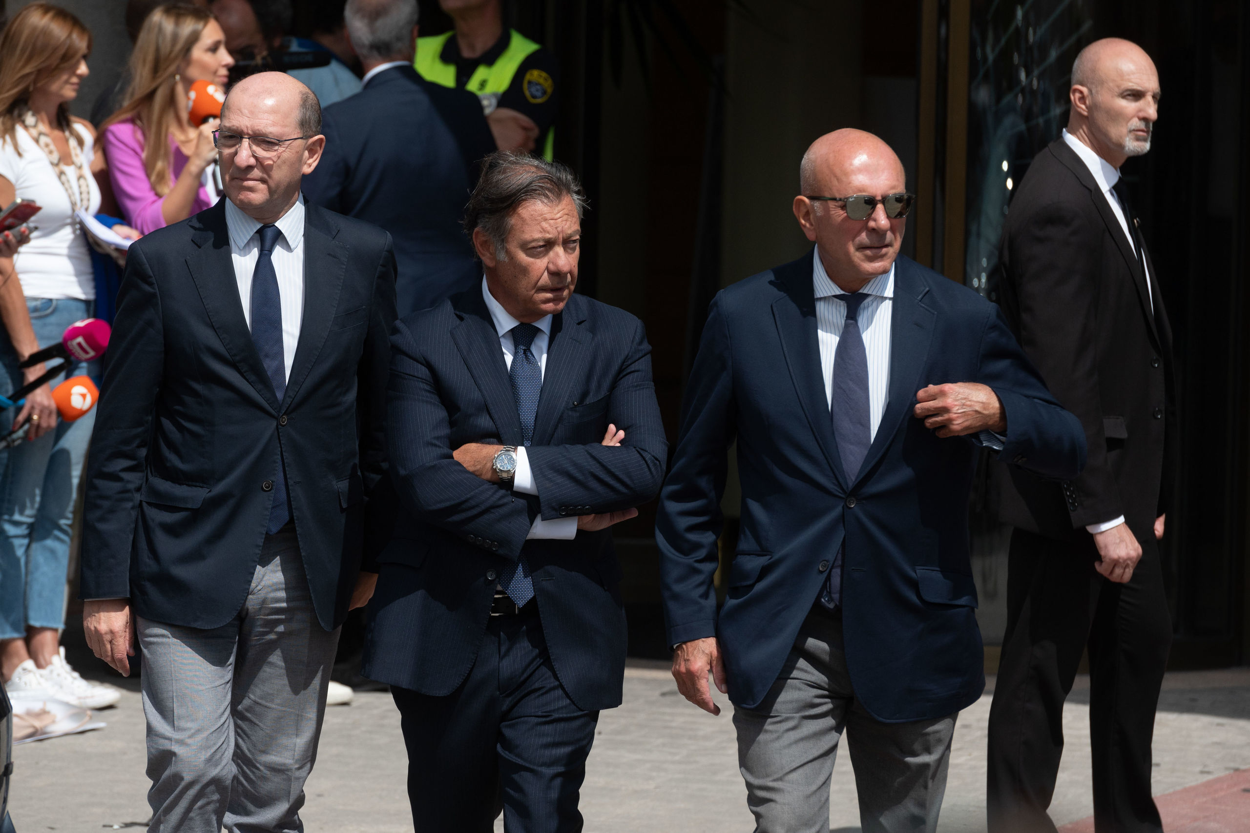 Alessandro Salem (c), y Manuel Villanueva (i), a su salida del tanatorio de La Paz de Tres Cantos donde ha quedado instalada la capilla ardiente de la periodista María Teresa Campos.