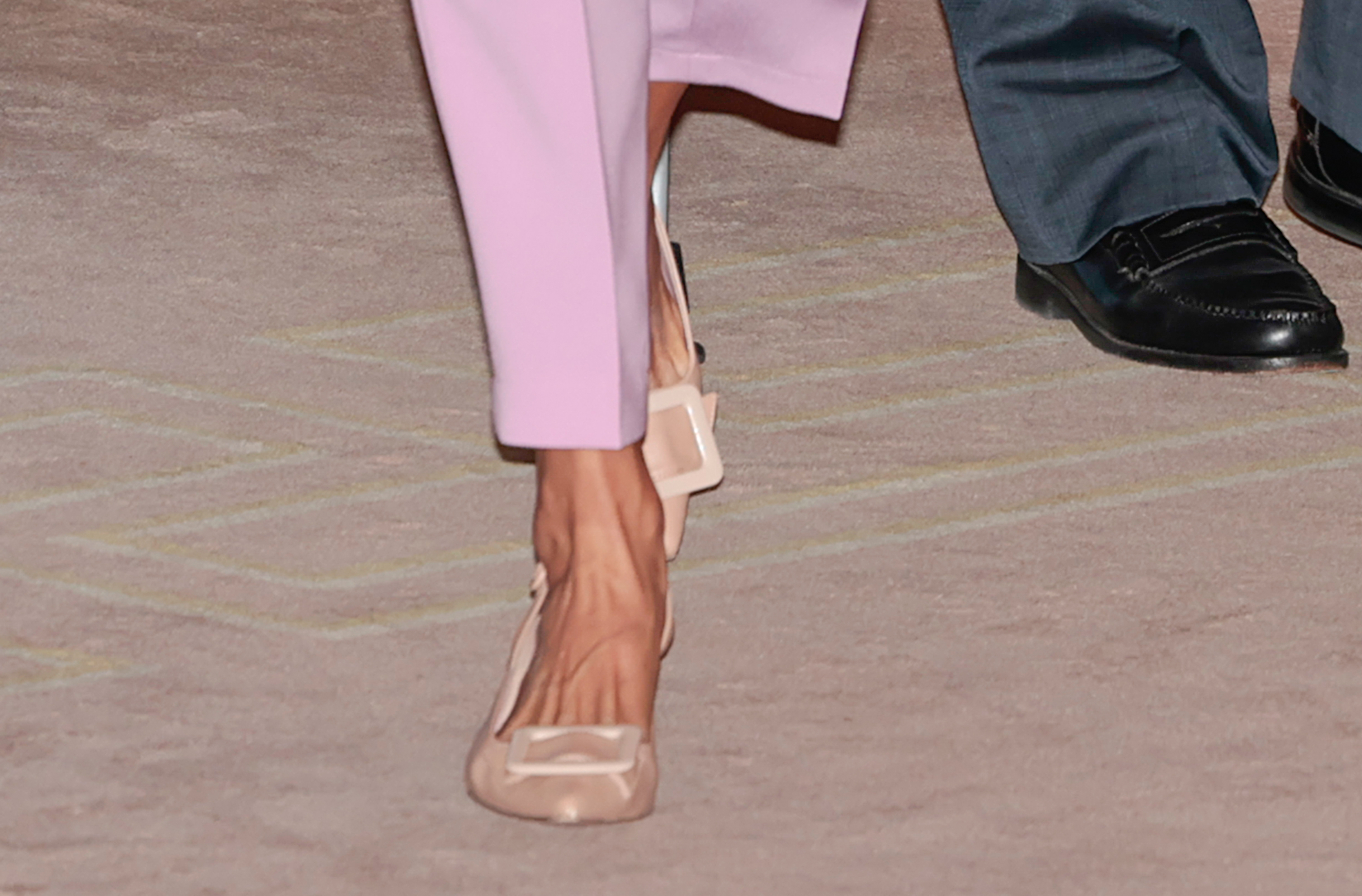 Una elección tan inesperada como favorecedora que ha combinado con blusa blanca de seda de la misma firma, y unos zapatos muy especiales, el modelo 'Carrie' de Isabel Abdo; unos salones destalonados en color nude con una hebilla cuadrada en la parte delantera creados en honor al personaje de Sarah Jessica Parker en 'Sexo en Nueva York', Carrie Bradshow.