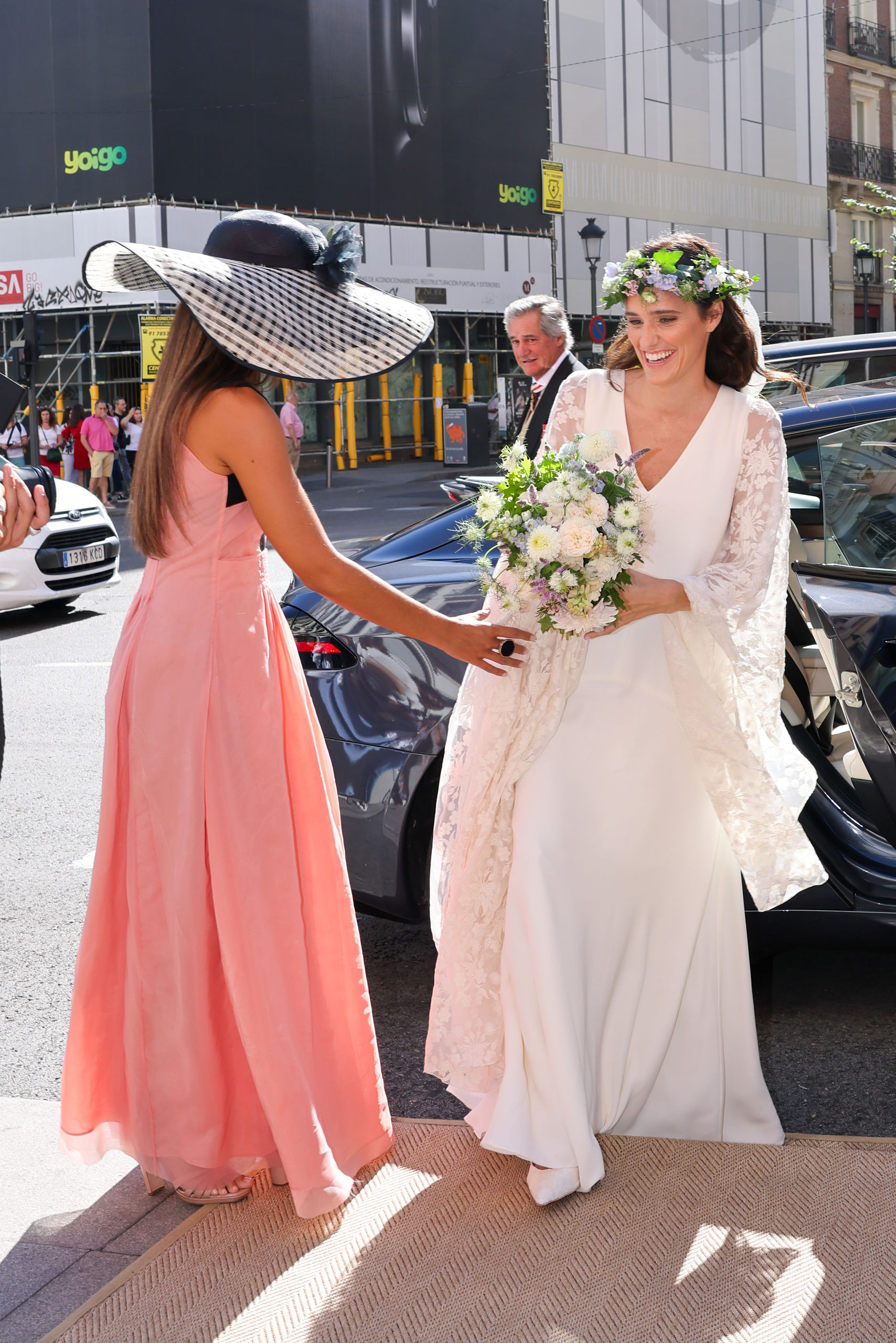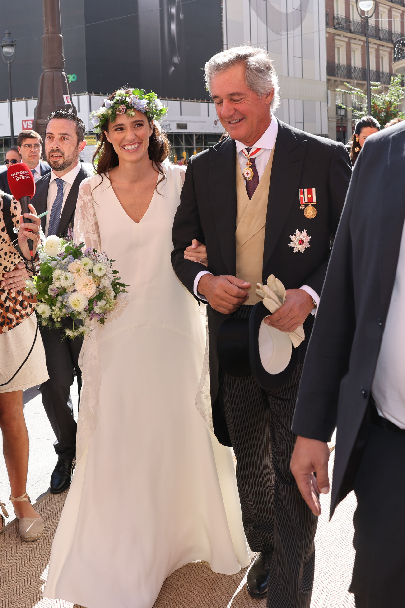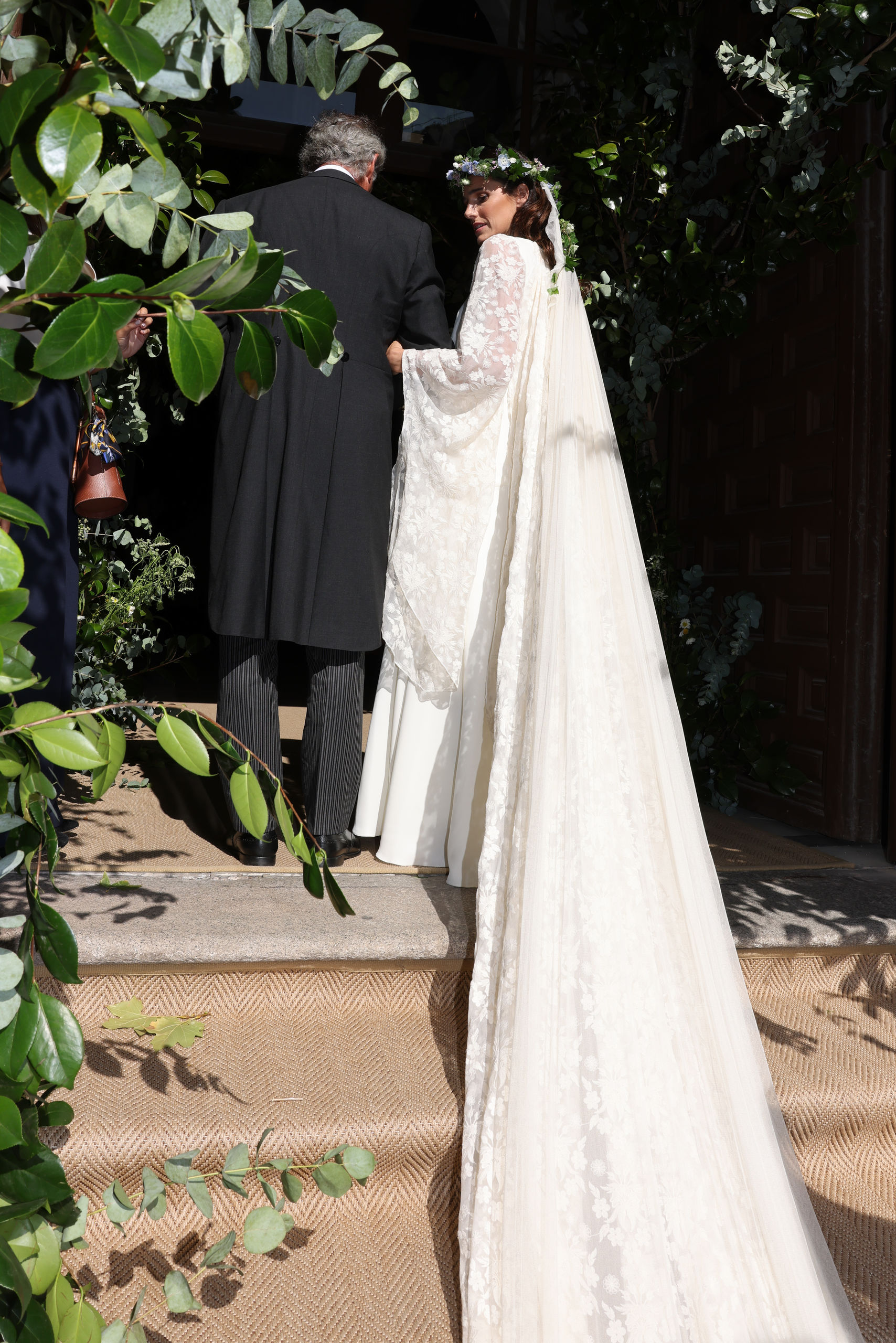 Muy emocionada y sin soltar el brazo de su padre, Clotilde Entrecanales ha llegado al templo luciendo un sencillo y clásico vestido. Un elegante y sofisticado diseño con escote de pico y mangas largas con volantes confeccionadas en un chantilly y un tejido translúcido.