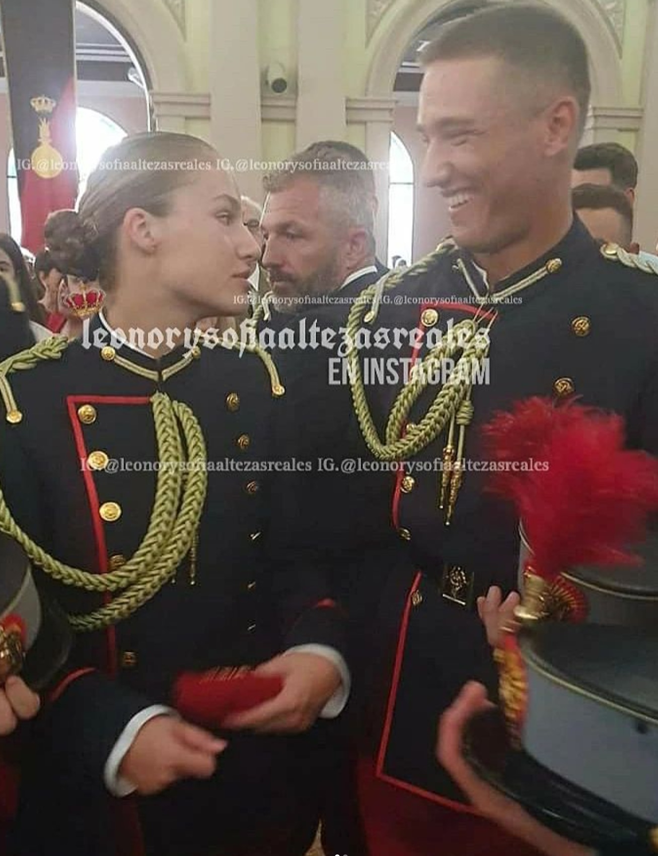 Estos cadetes se acercan, uno tras otro, a saludar a don Felipe y doña Letizia. Cuando llega uno de los muchachos, la sonrisa y la actitud de Leonor cambia hasta el punto de sonrojarse tímidamente. Sus padres parecen conscientes de la situación y buscan inmediatamente la reacción de su hija con la mirada. El cadete cruza unas breves palabras con ella y se suceden las sonrisas mientras se aleja. Una divertida situación que no tardó en viralizarse en redes sociales, donde se comenzó a fantasear con la idea de que haya algo entre ellos.